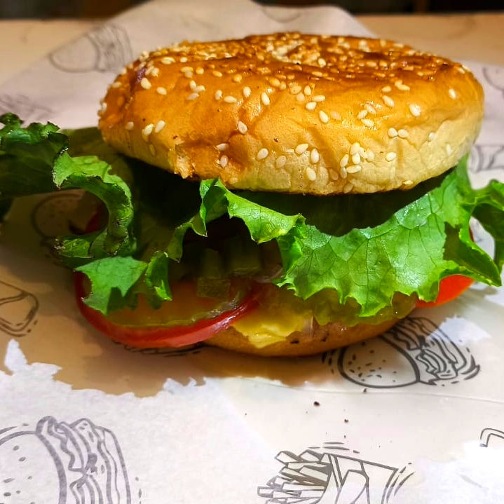 Hamburguesa con carne de res 90g, queso amarillo, pepinillos, jitomate, cebolla caramelizada, lechuga, chiles verdes en cuadritos y mayonesa