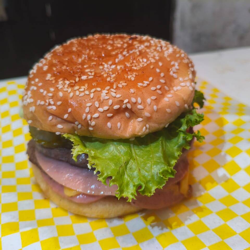 Hamburguesa con dos carnes de res de 90g cada una, tocino, jamon, queso amarillo, lechuga, jitomate, cebolla caramelizada, pepinillos, chiles verdes en cuadritos y mayonesa.