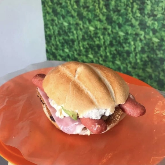 Pan de Hotdogs, Salchicha, Tocino, Piña en Trozos, Jamon, Cebolla Caramelizada, Chiles Jalapeños de la Casa, Mayoneza, Ketchup y Mostaza