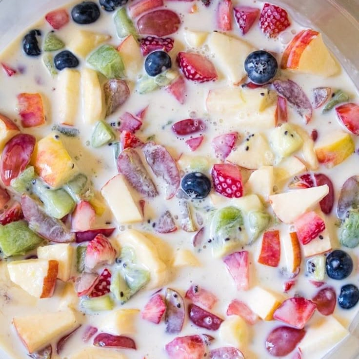 500 gr de ensalada de manza, durazno y fresas con crema dulce de la casa
