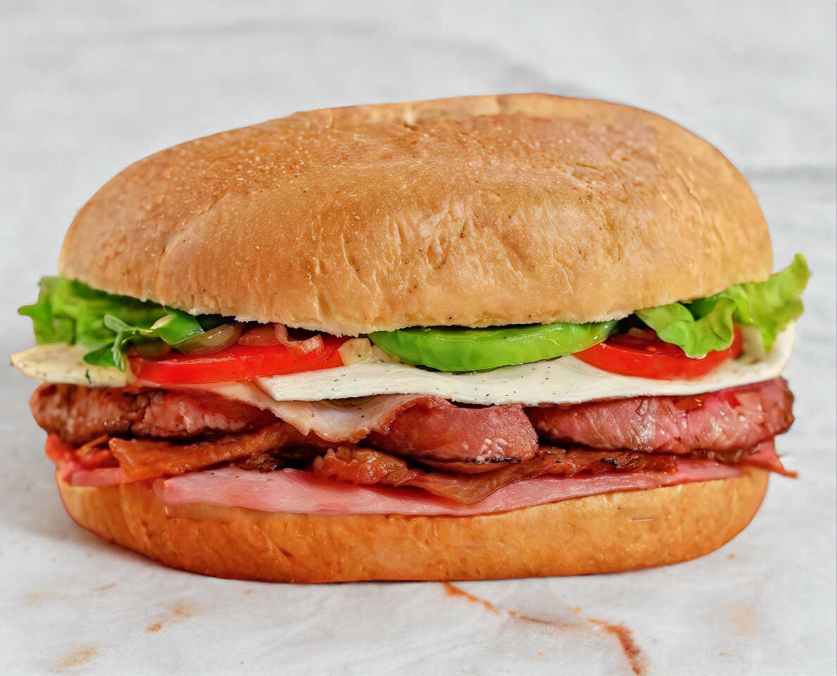 Carne de res, jamón, tocino, queso amarillo y salchicha asada