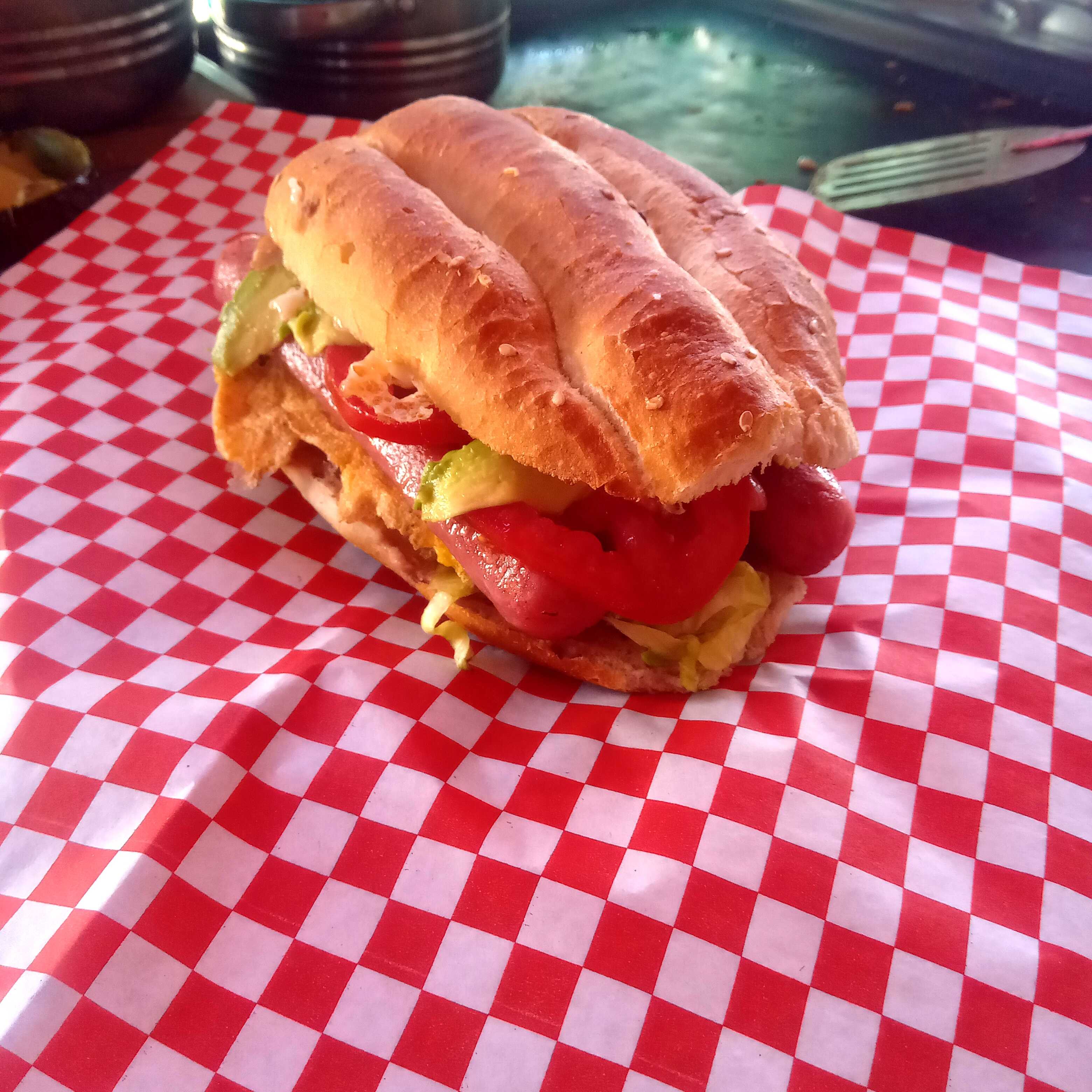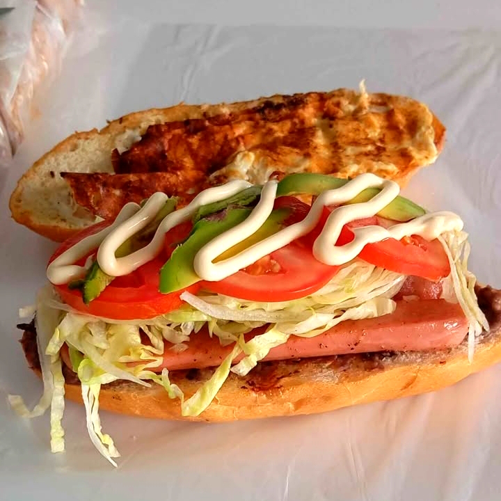 Telera bistec enchilado frijoles lechuga queso fundido salchicha jitomate cebolla chiles jalapeño aguacate mayonesa
