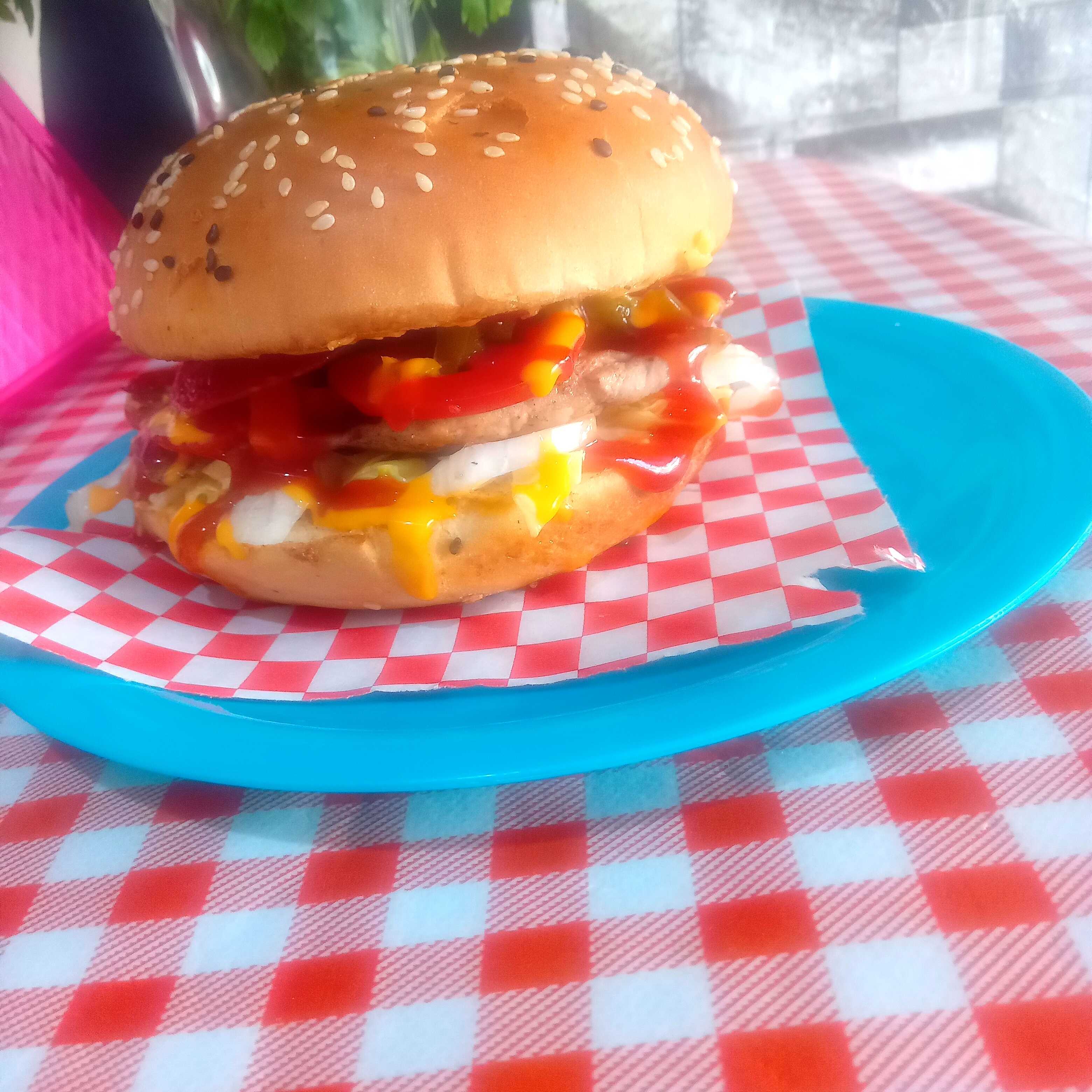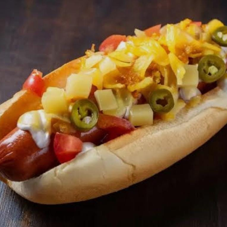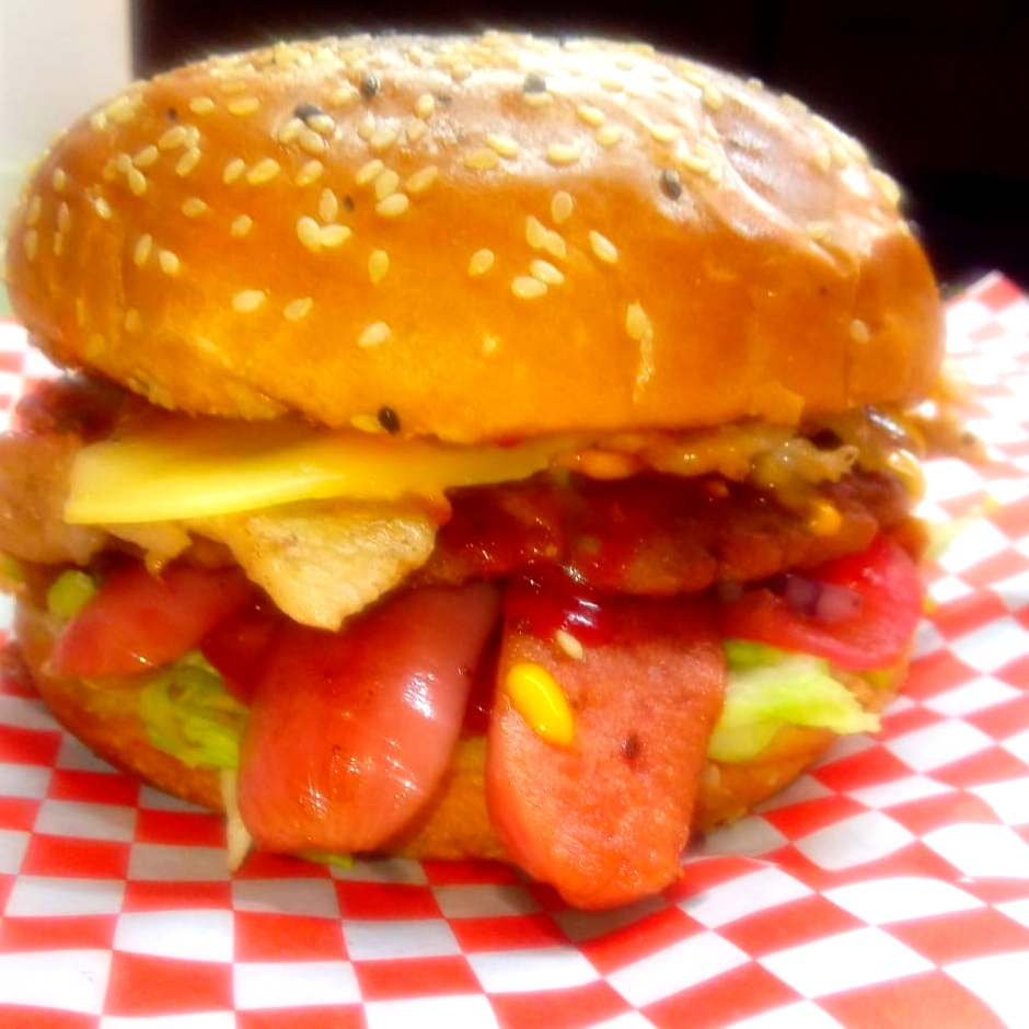 Deliciosa Burger con carne sirloin bistec de res queso manchego y peperroni y salchicha asada