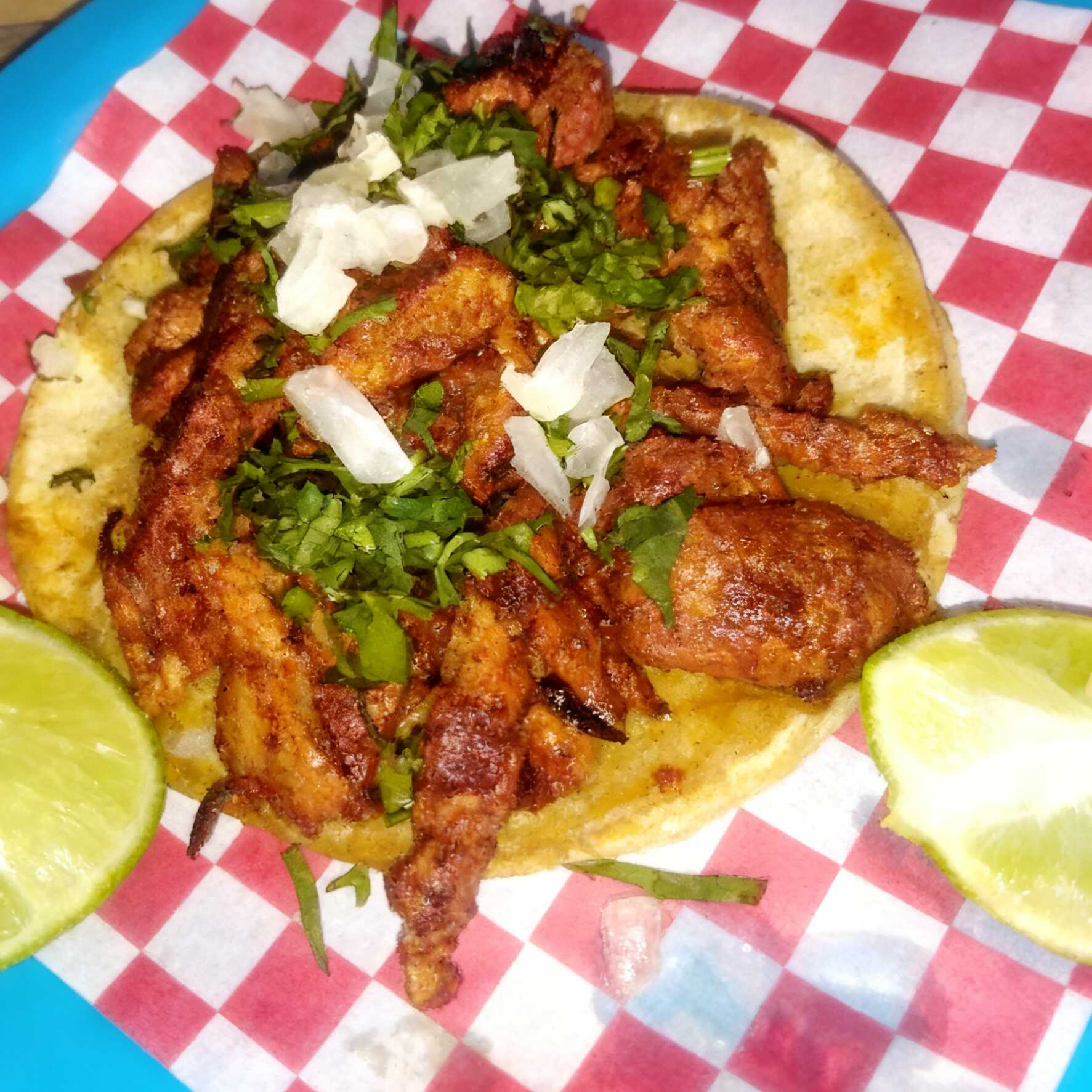 Taco con doble tortilla bistec enchilado silantro cebolla limón y salsas verde o roja