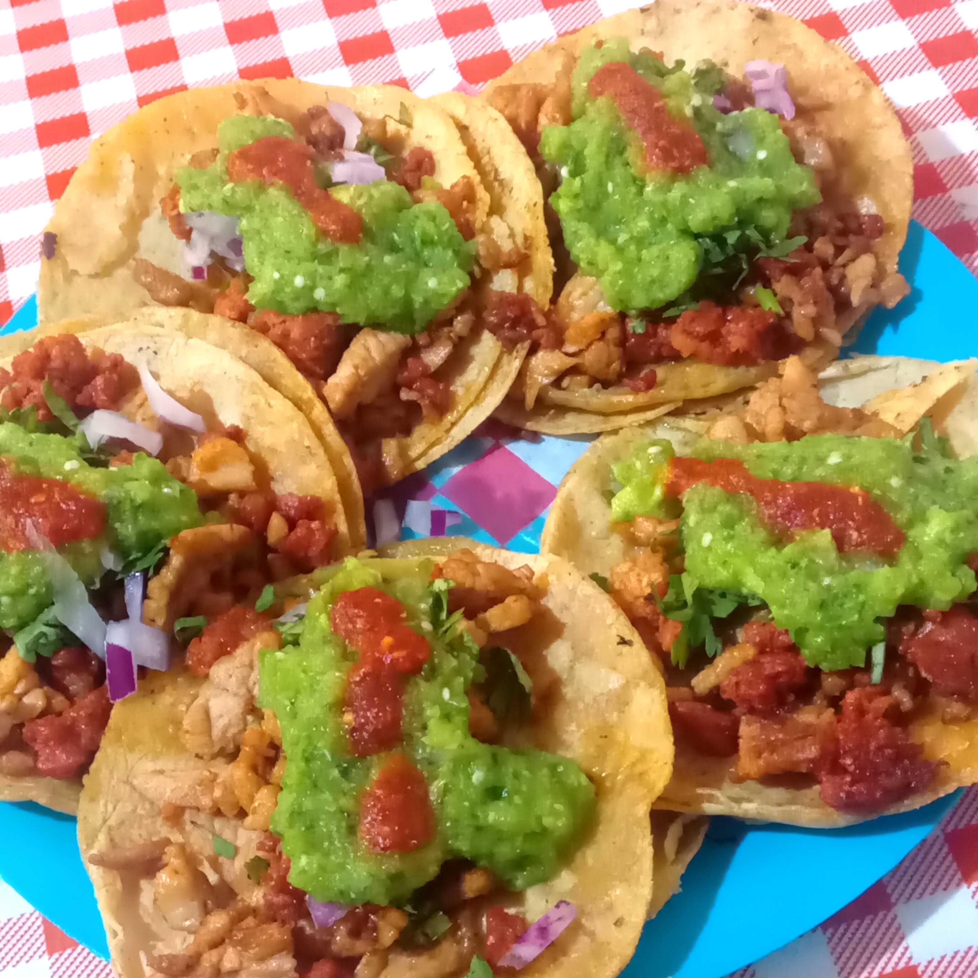 Tacos con doble tortilla surtido de bistec y longaniza silantro y cebolla con salsa verde o roja