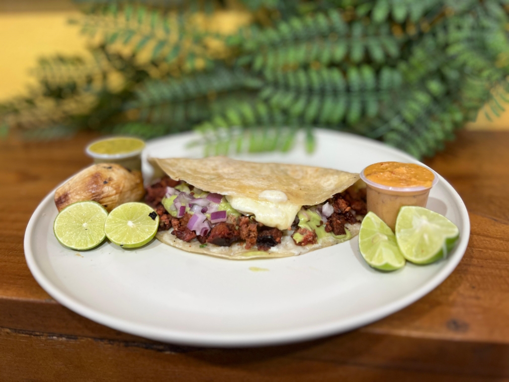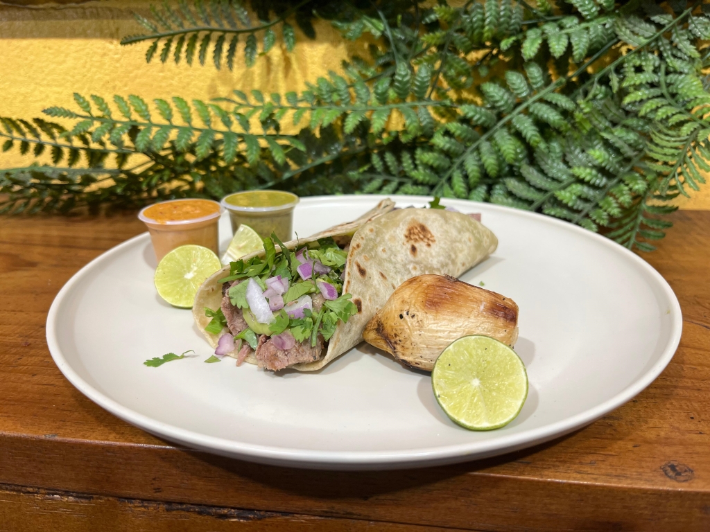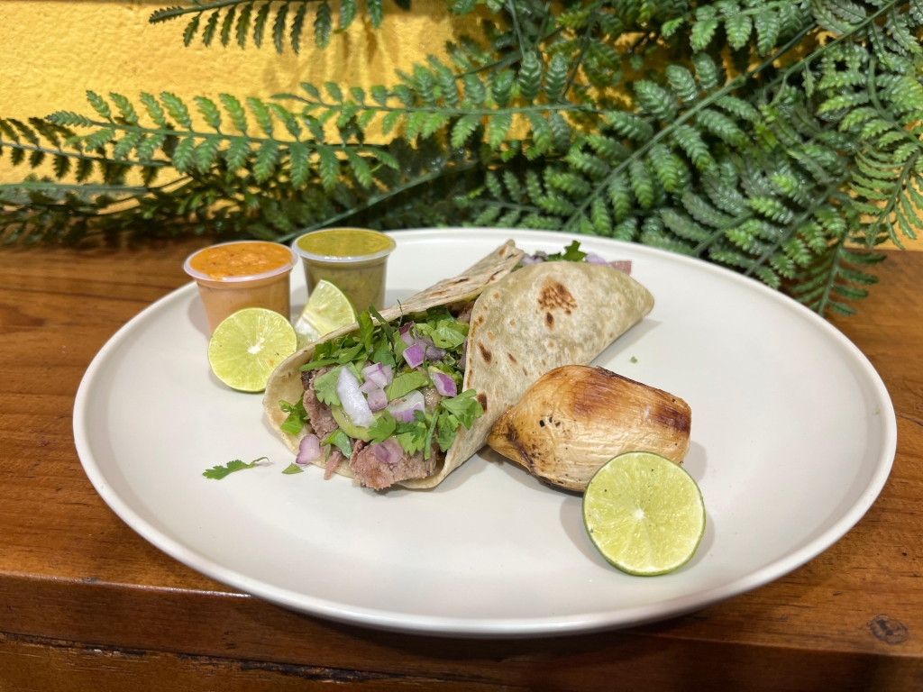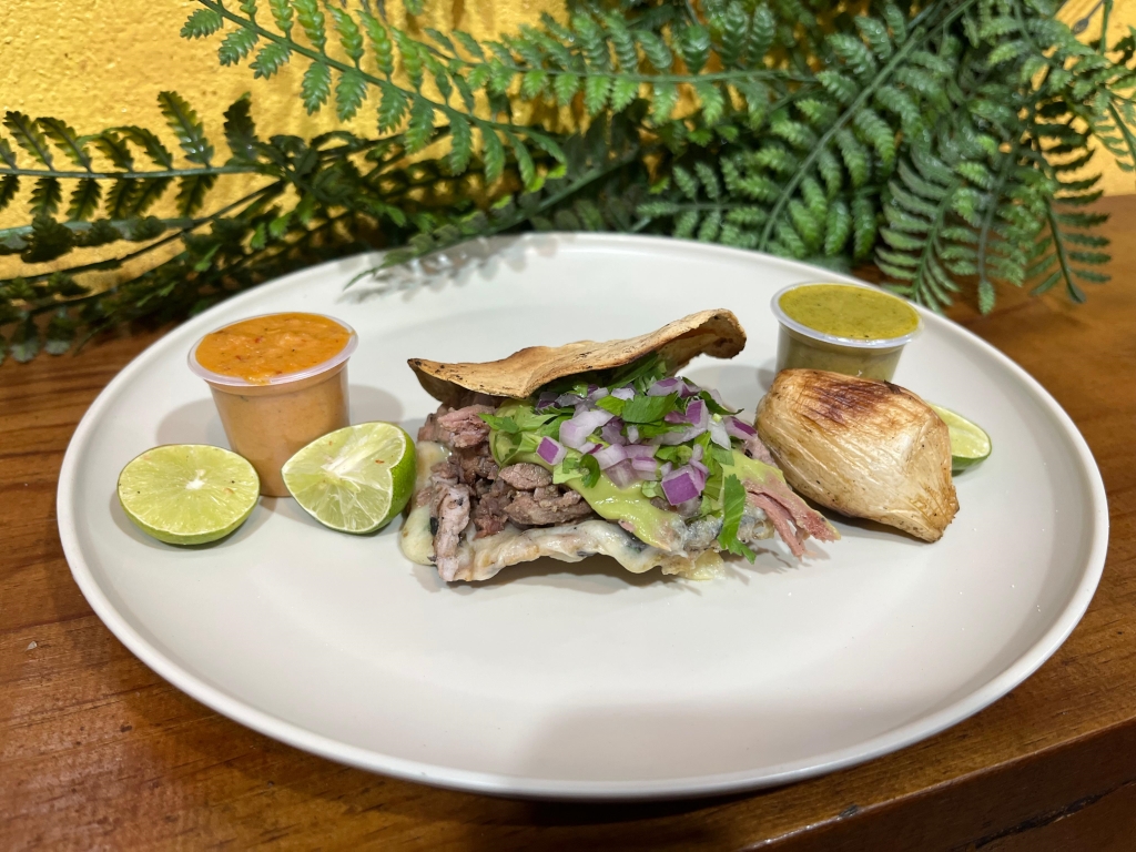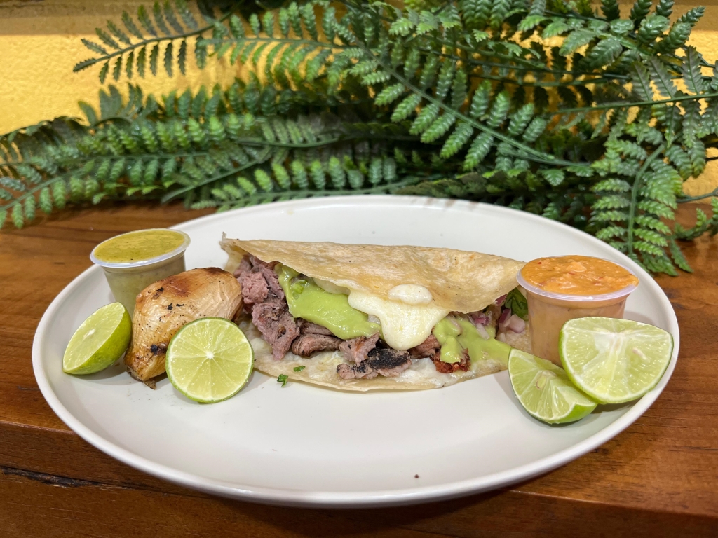 Tortilla de Harina XL con queso fundido; Arrachera y mucho Guacamole