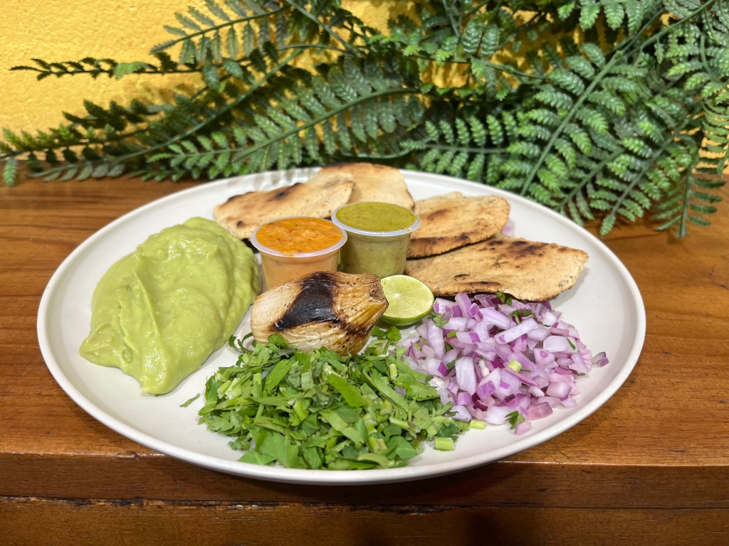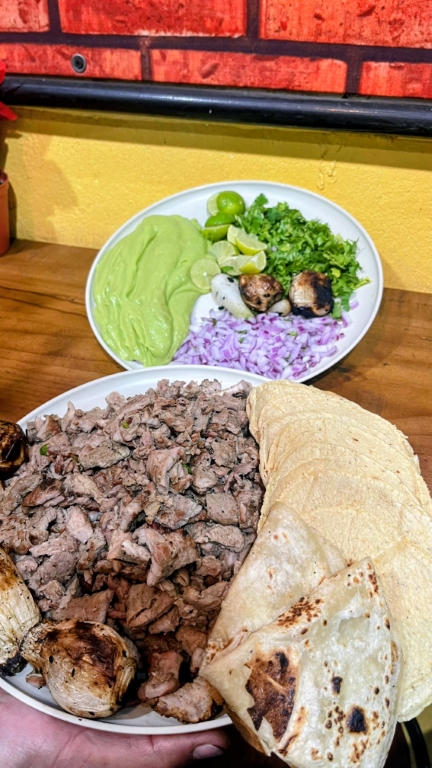 Deliciosa carne Asada de Arrachera de Primera. Incluye: Tortillas, Guacamole, Cilantro, Cebolla, Cebollitas, y Salsas