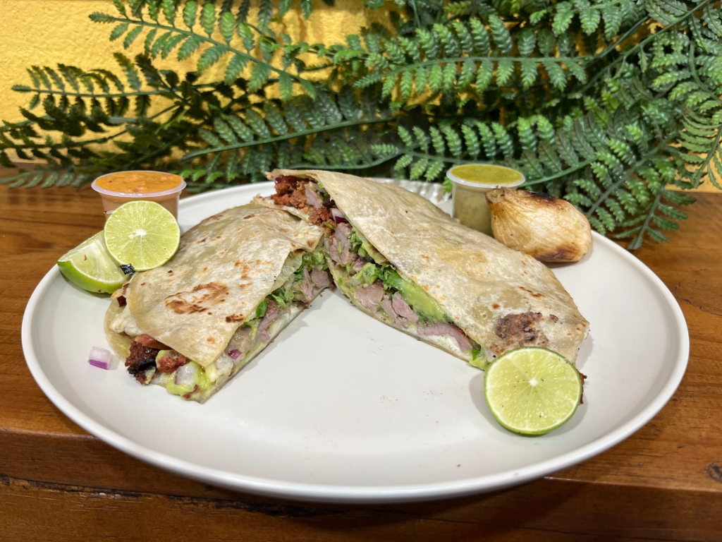 Tortilla de Harina XL con queso fundido; Sirloin, Longaniza y mucho Guacamole