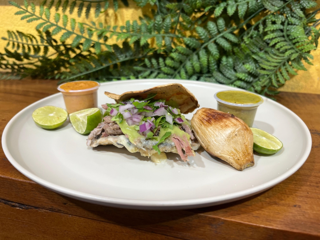 Tostada con Queso Fundido, Sirloin y Longaniza