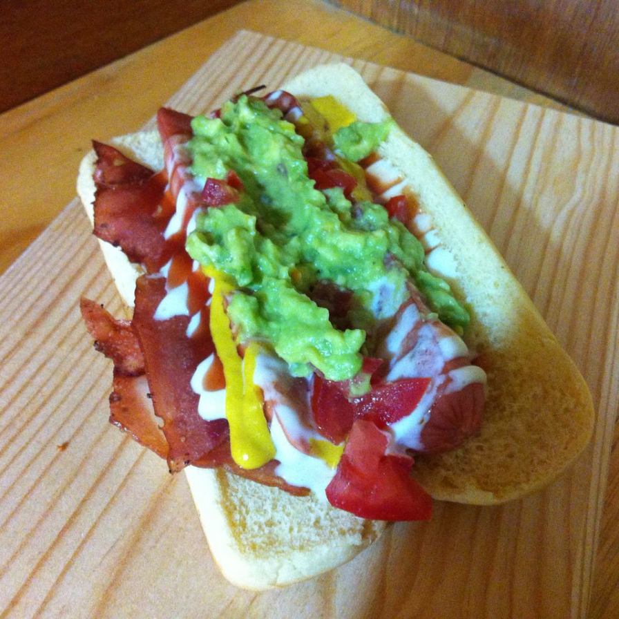 hot dog con salchicha de pavo asada tocino , cebolla jitomate y aderezos