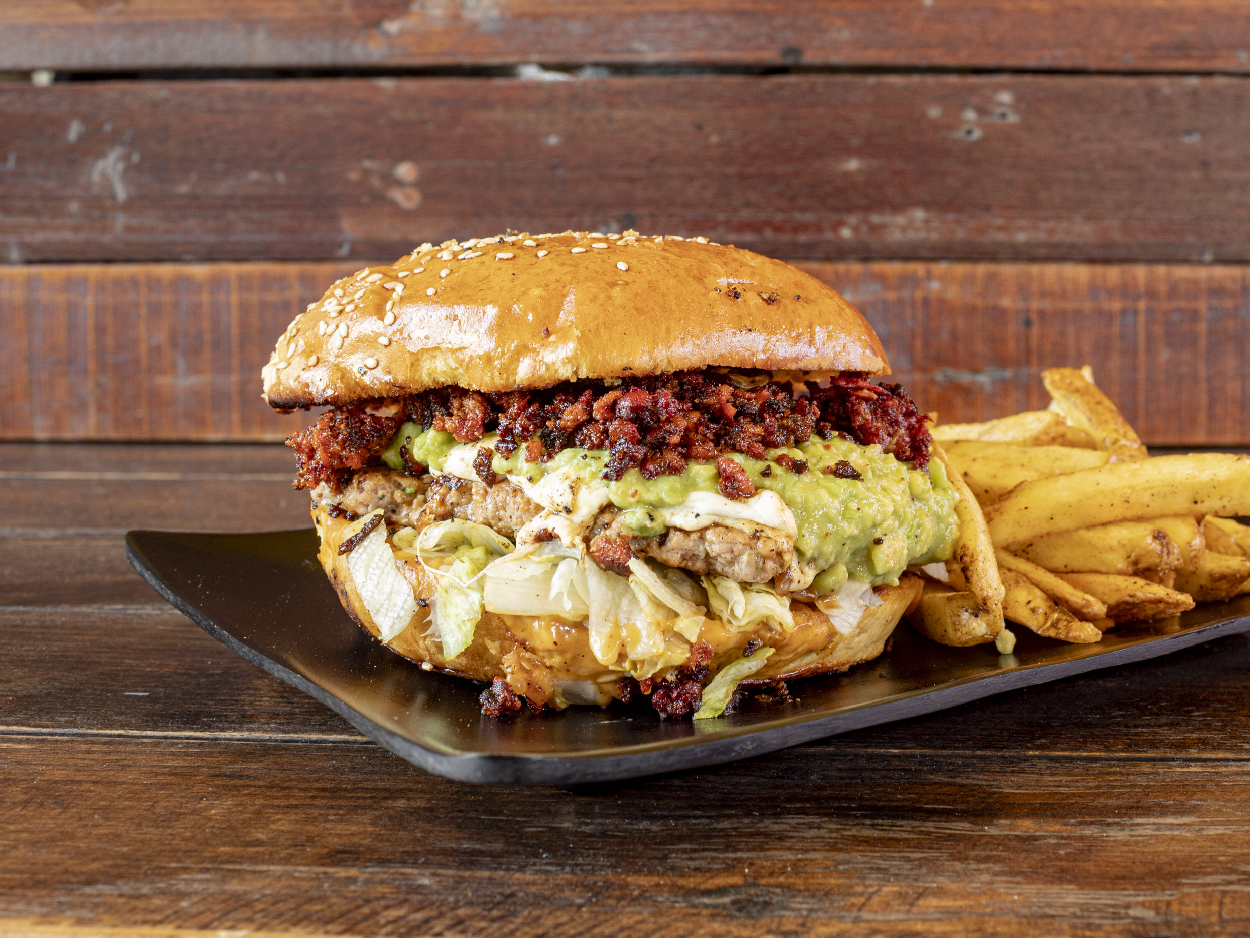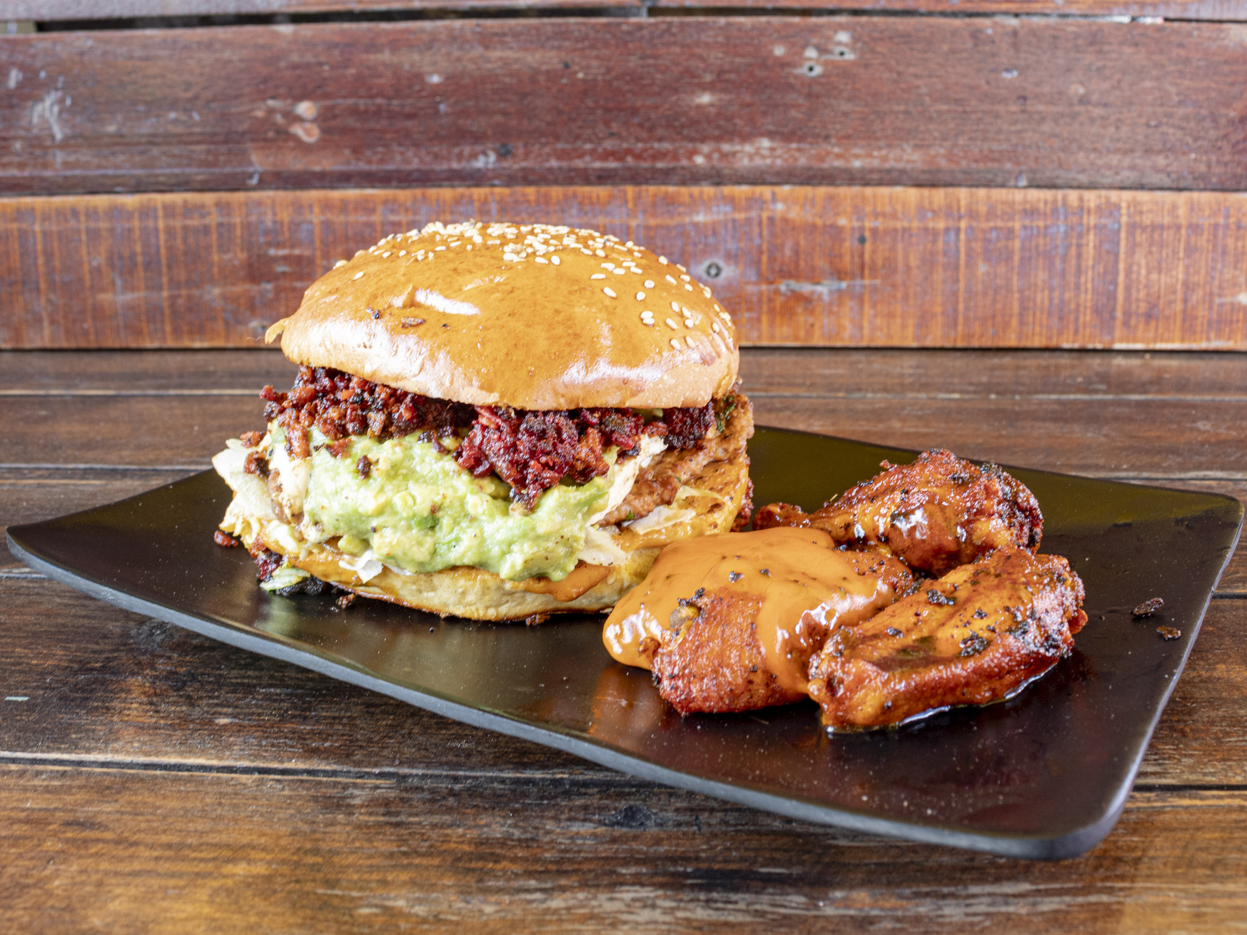 Pan artesanal brioche, aderezo VT, lechuga picada, carne de res, costra de quesillo, guacamole y longaniza doradita.