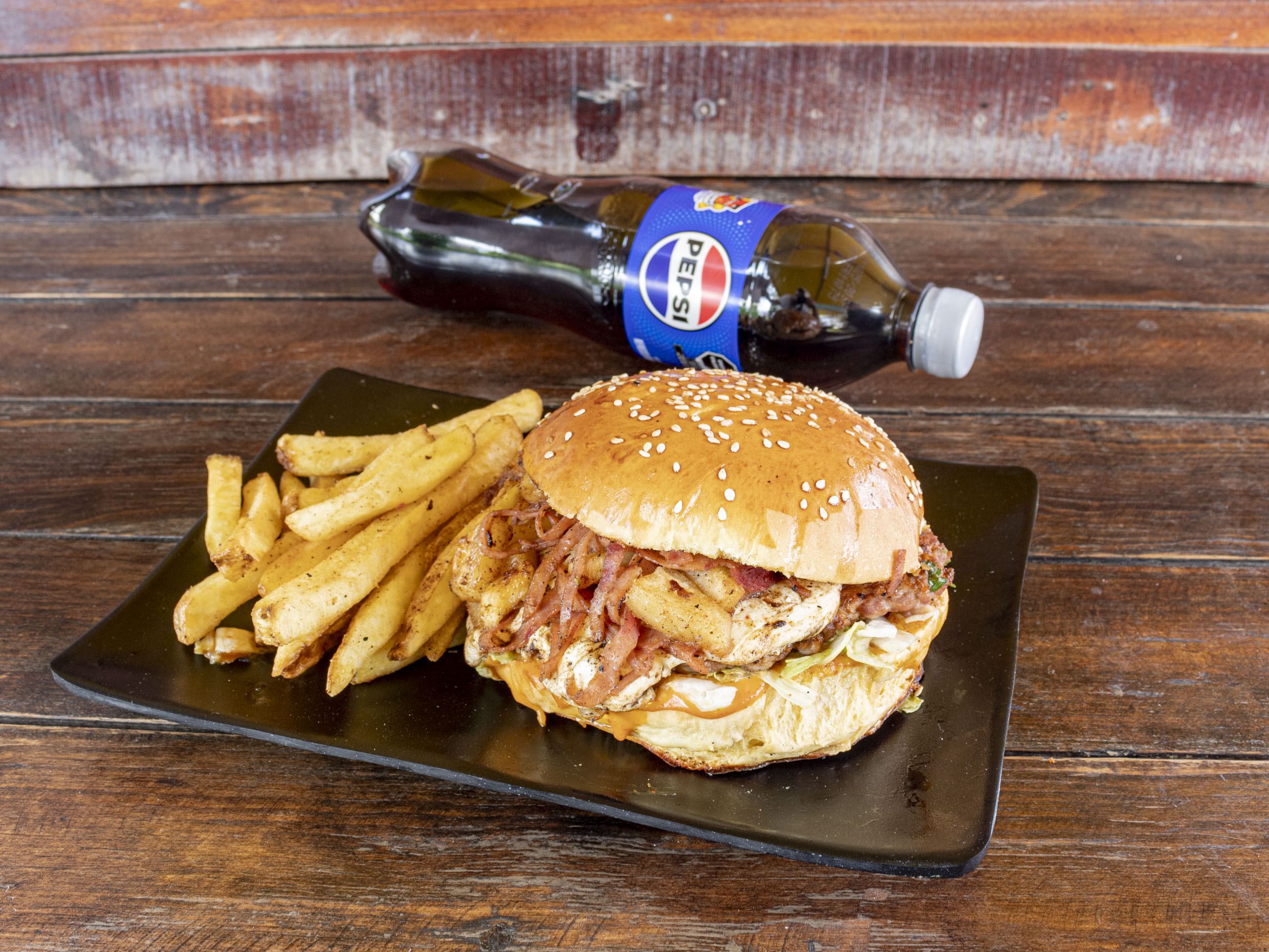 Hamburguesa a elegir, guarnición de papas y bebida a elegir.