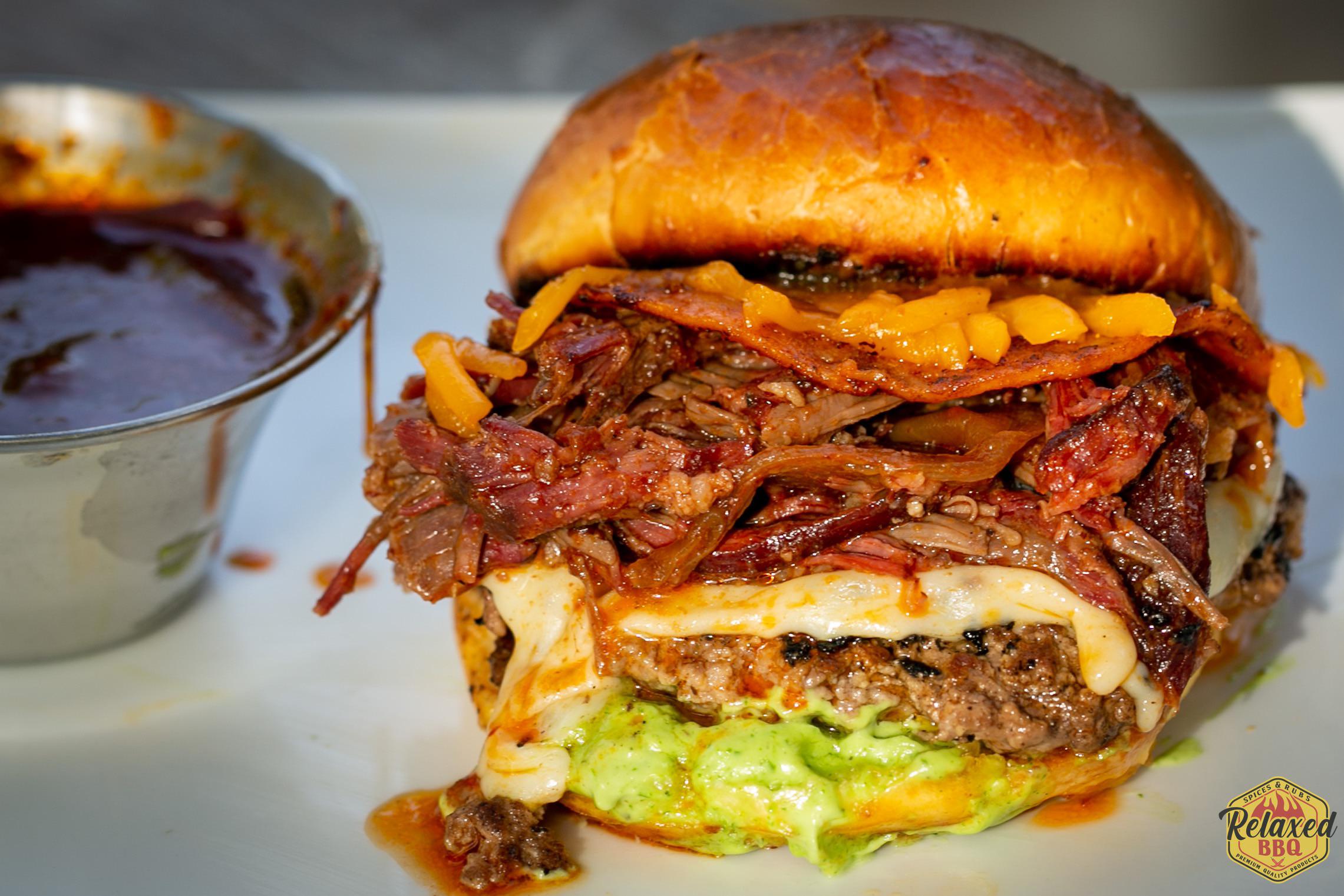 Pan artesanal brioche, aderezo VT, carne de res, birria de res, costra de quesillo, cebolla caramelizada con consomé de birria y lechuga.
