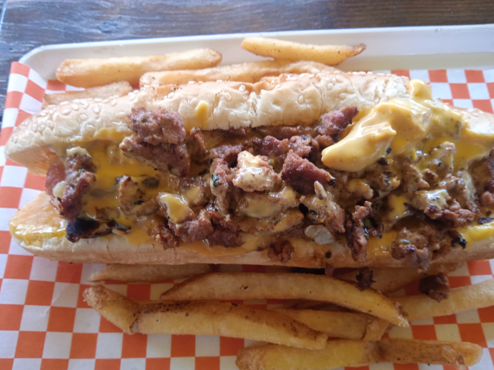 Pan con salchicha de pavo (15cm), carne de hamburguesa, aderezo VT y queso cheddar.