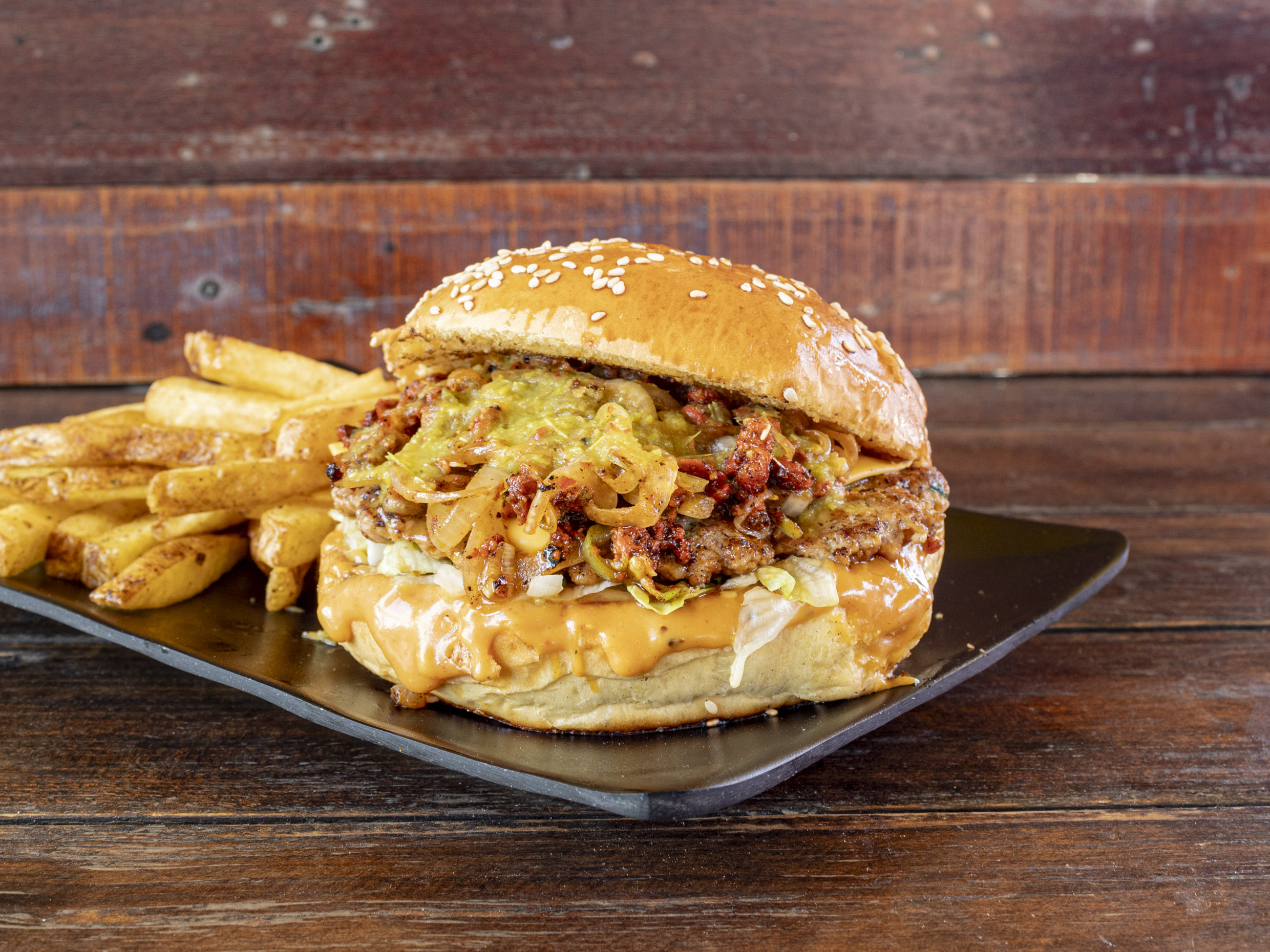 Pan brioche artesanal, aderezo VT, lechuga picada, carne de res, queso americano, jamón, mix de cebolla caramelizada, longaniza y habanero toreado para finalizar con salsa de habanero jalapeño.