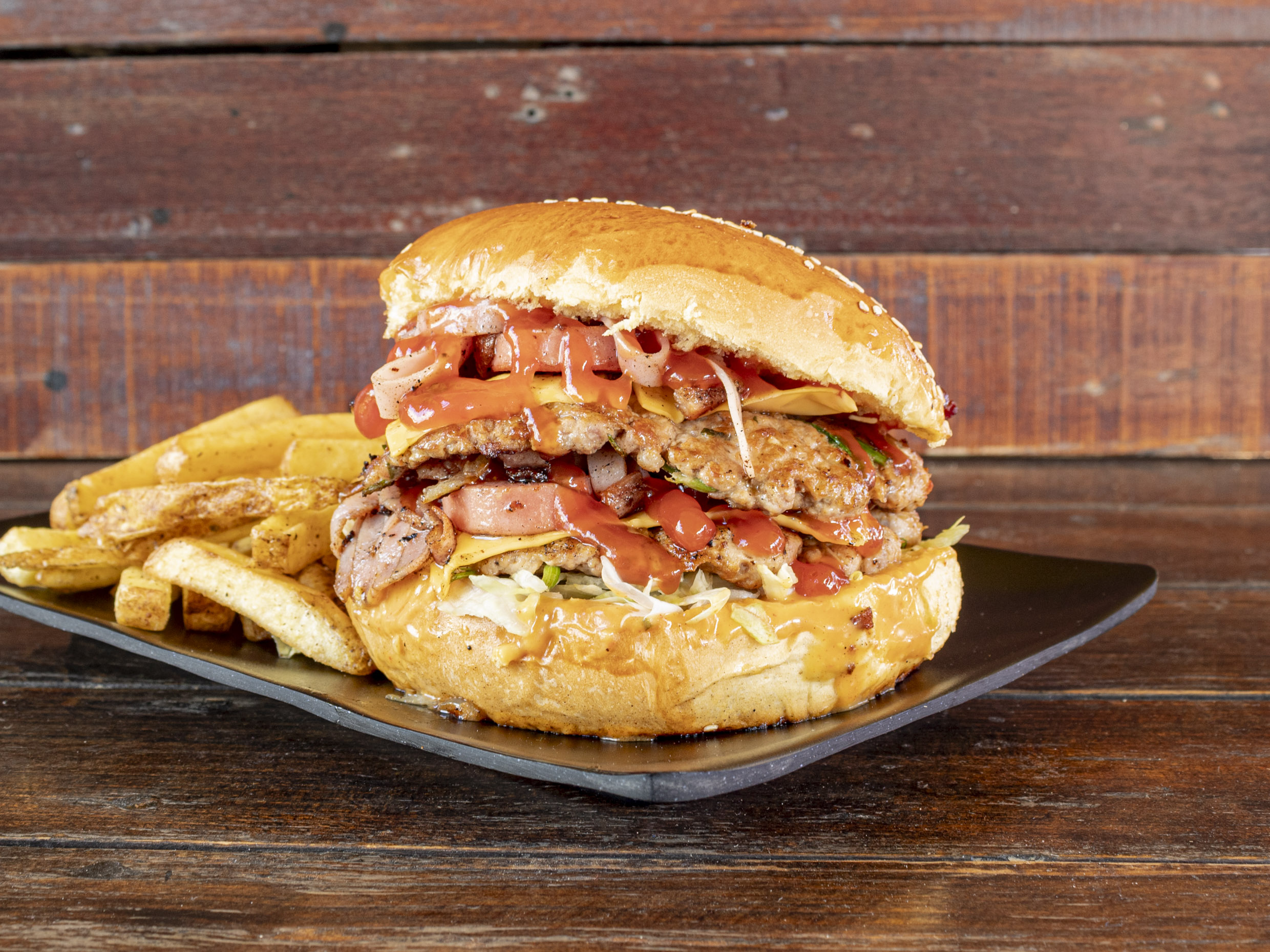 Pan brioche artesanal, aderezo VT, lechuga, carne de res, salchicha, tocino, jamón, cebolla caramelizada y queso americano.