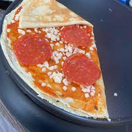 Ahora puede disfrutar una crepa rellena de chorizo con salsa de pizza y queso de tu elección.