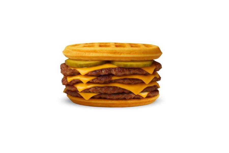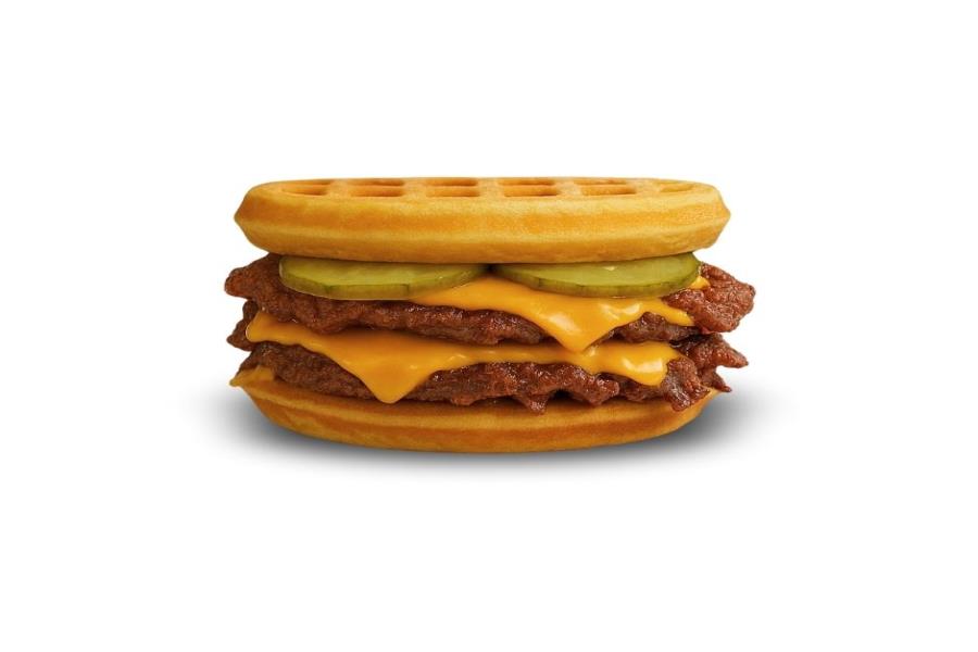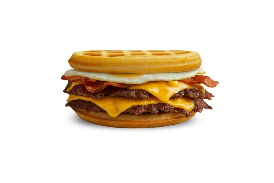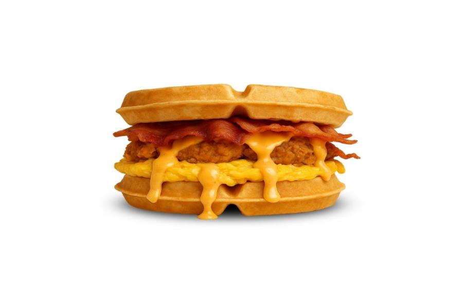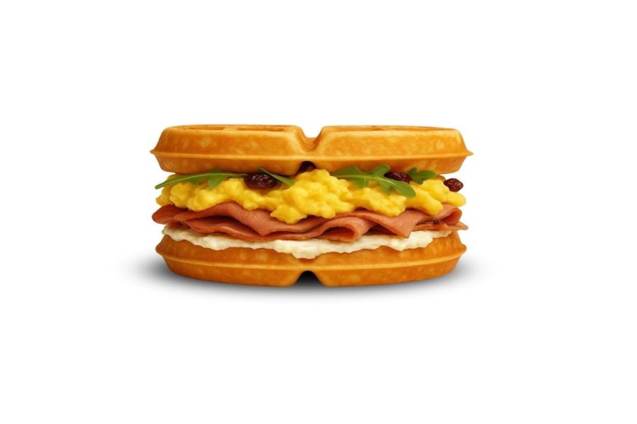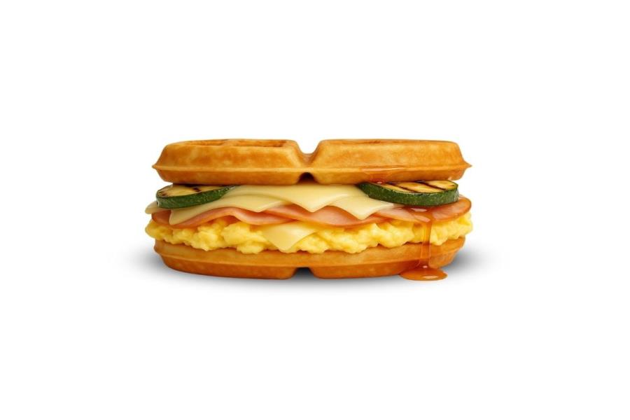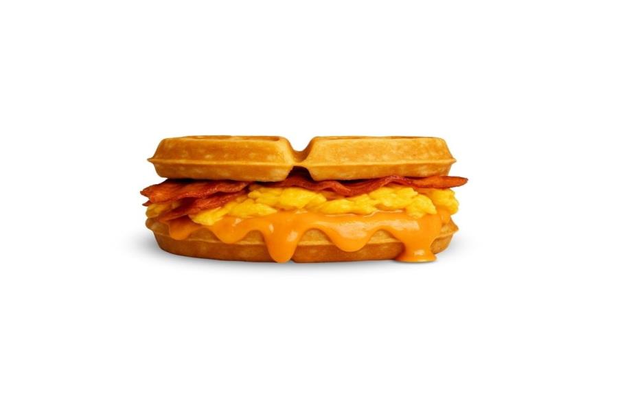 1/2 WAFFLE, TOCINO CRUJIENTE, HUEVO REVUELTO Y QUESO AMERICANO.