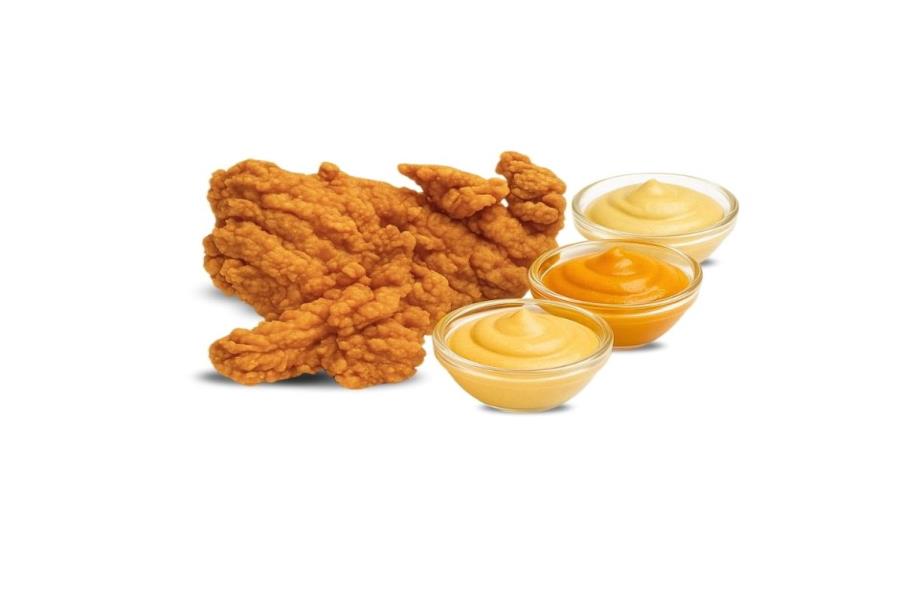 TIRAS DE POLLO FRITO (120 G) ACOMPAÑADAS CON TRES ADEREZOS A ELEGIR.