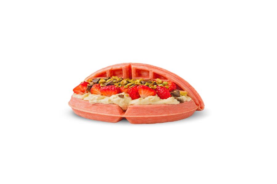 SANDWICH DE WAFFLE ROSA CON QUESO CREMA, FRESAS, CHOCOLATE Y PISTACHES.