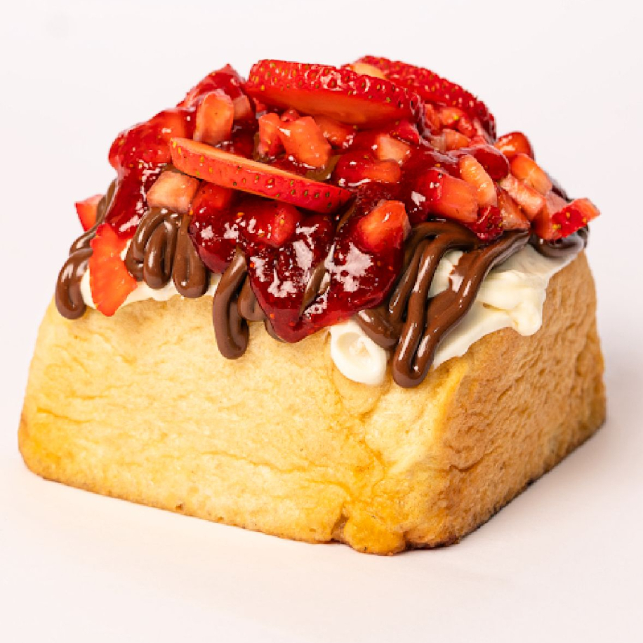 Esponjoso Roll de canela con Topping de Nutella y trozos de fresas.