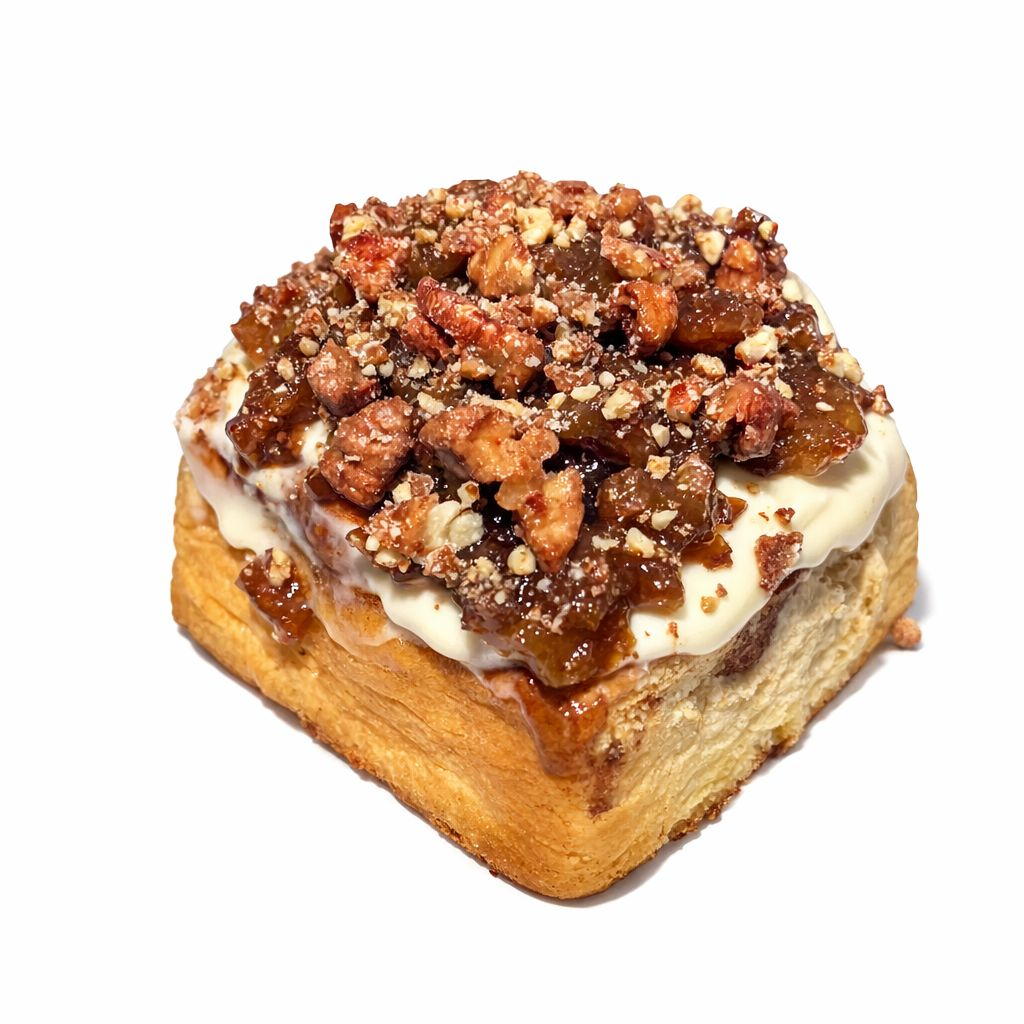 Esponjoso Roll relleno de canela con topping de manzana y nueces pecanas grapiñadas