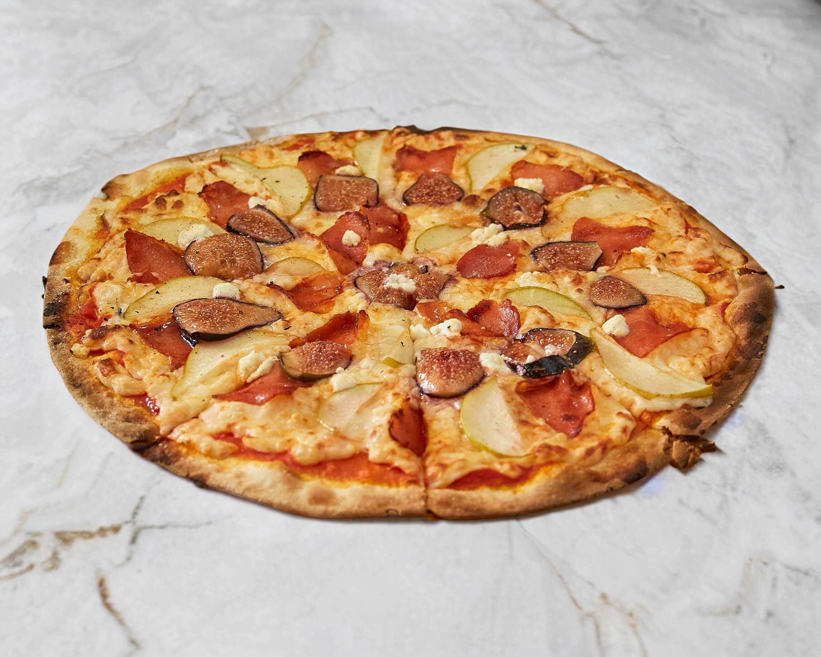Salsa pomodoro, queso mozzarella, lomo embuchado, higo y pera cristalizados en miel con queso de cabra.