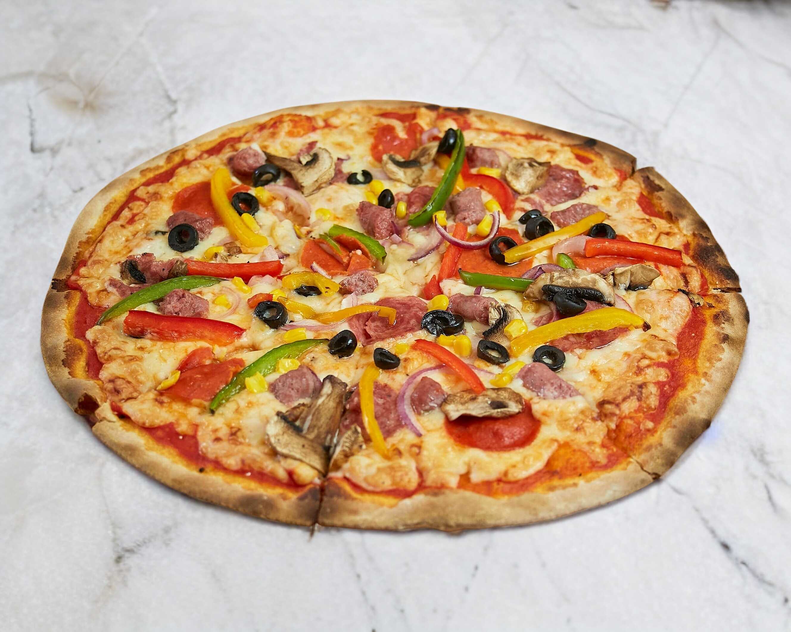 Salsa pomodoro, queso mozzarella, salami, pepperoni, salchicha italiana, pimiento, cebolla morada, champiñones, granos de elote y aceituna negra.