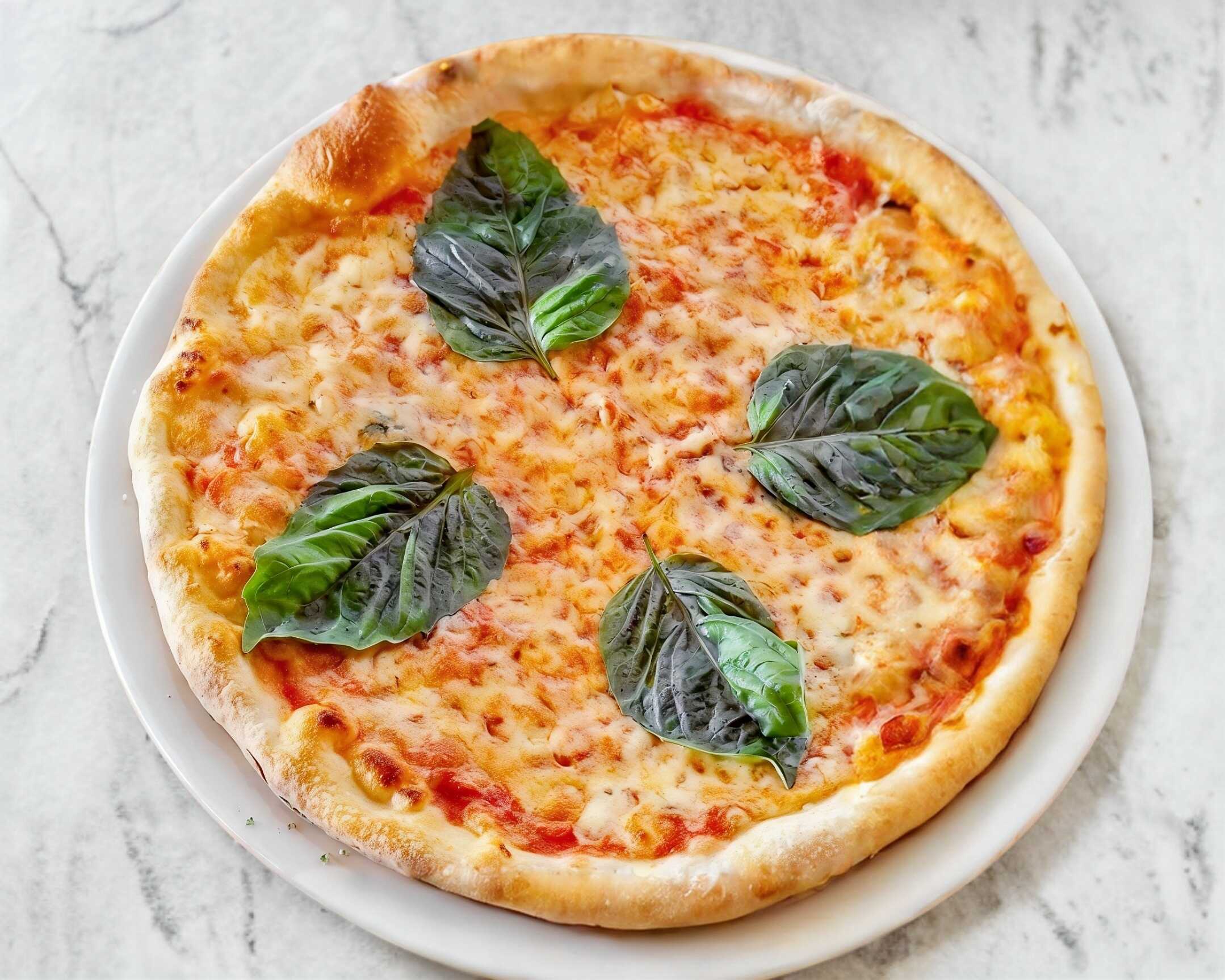 Pizza tradicional margherita con salsa pomodoro, queso mozzarella, hojas de albahaca y aceite de oliva.
