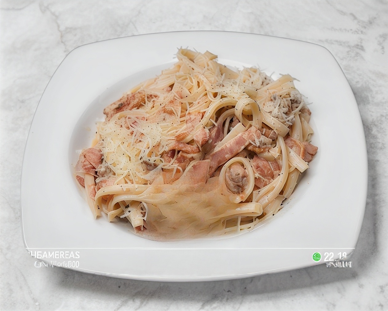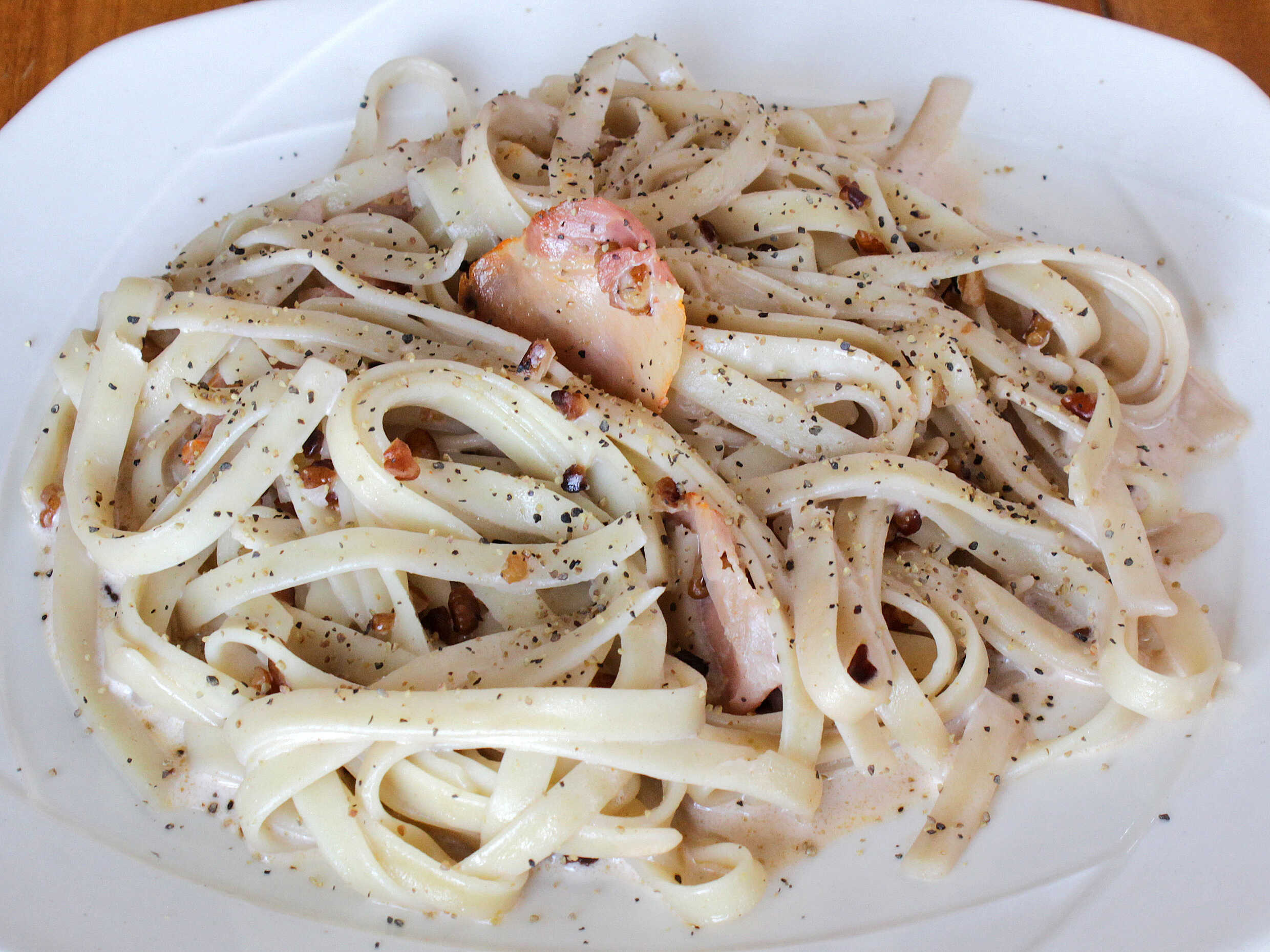 Spaghetti o fetuccini con crema de nuez, brandy, lomo canadiense, nuez y queso parmesano.