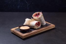 Wrap relleno de jamón serrano, tomates confitados, queso parmesano, aceitunas negras, aceite de albahaca y aderezo de oliva.