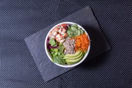 Ensalada de arúgula, con camarones, aguacate, pepino zanahoria, semillas de girasol tostadas y aderezo a base de mayonesa picante y ajonjolí.