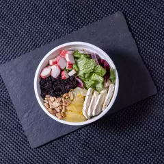 Ensalada de mix de verdes, con zanahoria, tomates cherry, repollo morado, lomitos de pollo, camote glaseada y aderezo honey mustard.