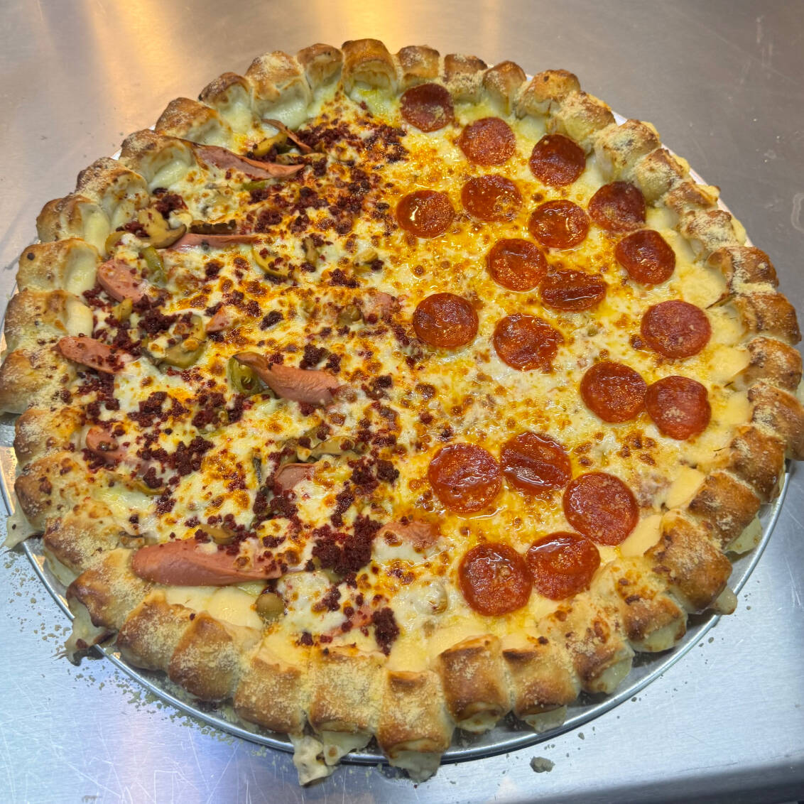 Pizza Grande 1/2 Pep, 1/2 Hw con Orilla de Queso