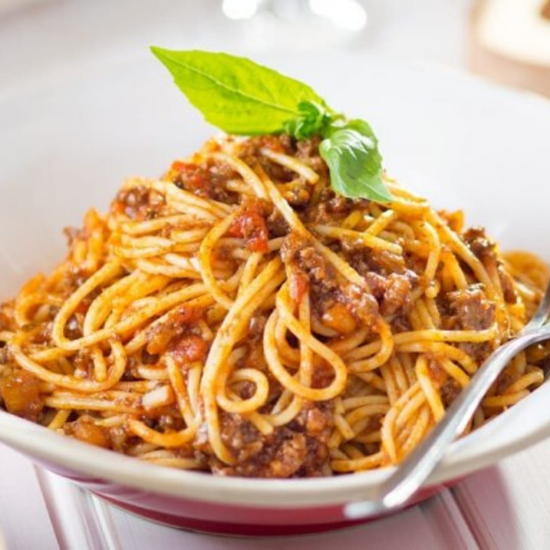 Salsa boloñesa preparada en casa con carne de res molida, cebolla, zanahoria, apio y decoramos con queso parmesano.