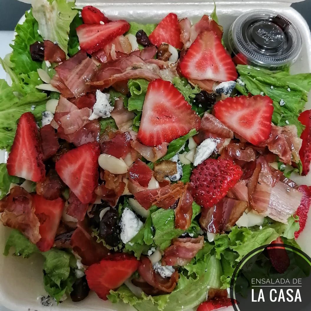 Lechuga italiana, fresas, arándanos, almendras tostadas, tocino, queso de cabra y reducción de vinagre balsámico como aderezo.