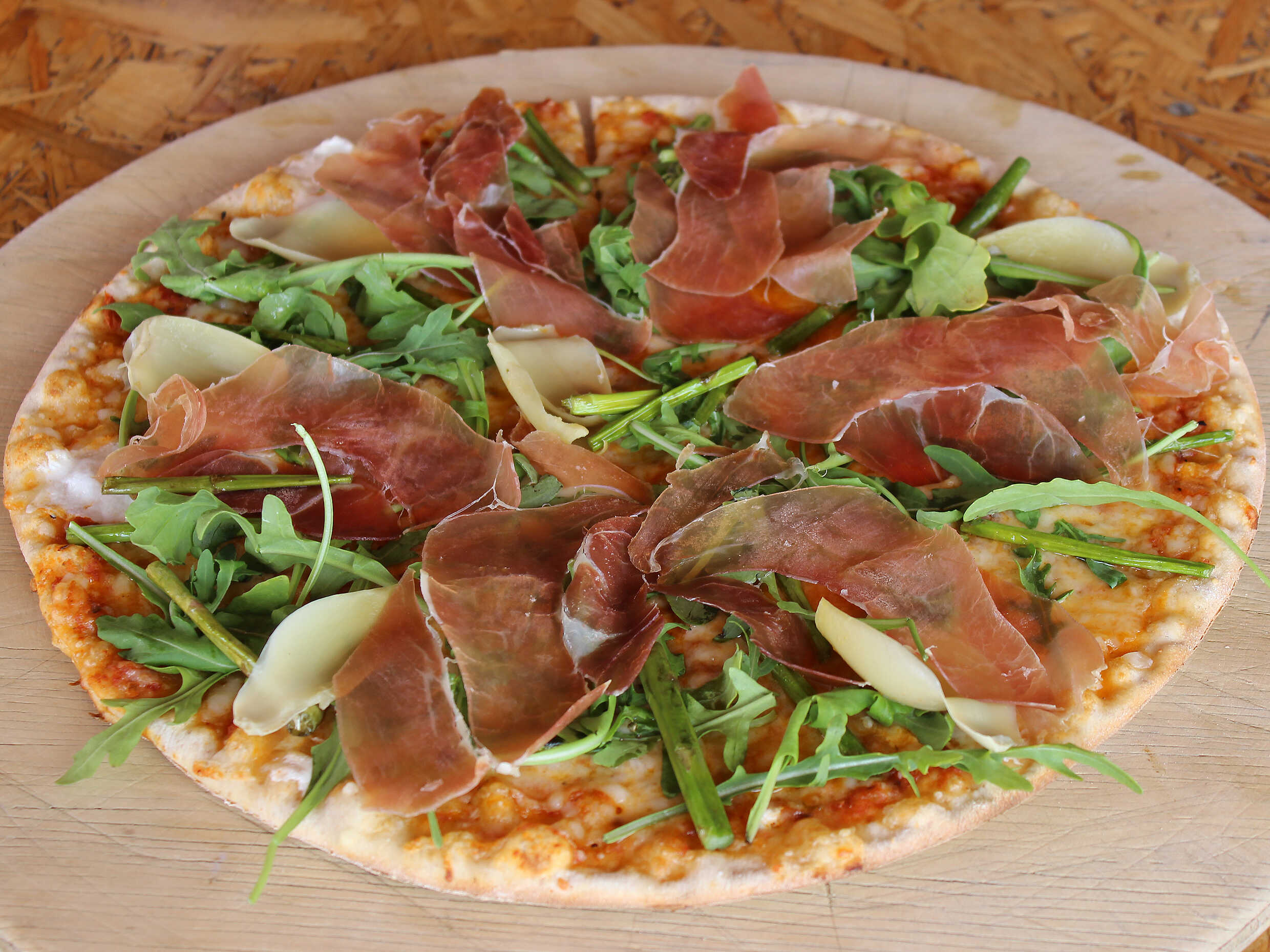 4 Quesos, alcachofas, espárragos, jamón serrano y arúgula.