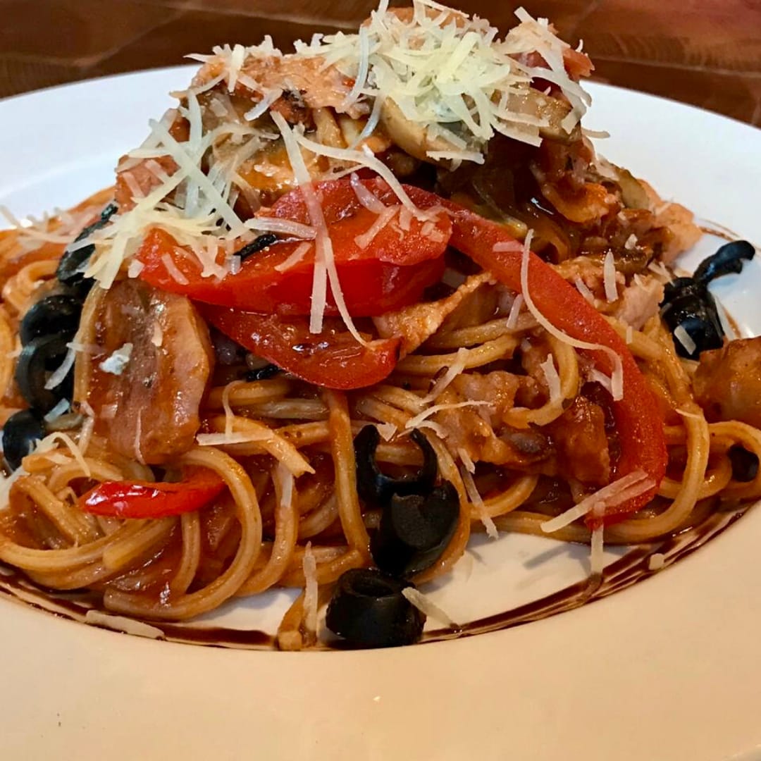 Salsa de tomate preparada en casa, tocino, salchicha italiana, pimientos, champiñones frescos, aceitunas negras, perejil y pepperoni.