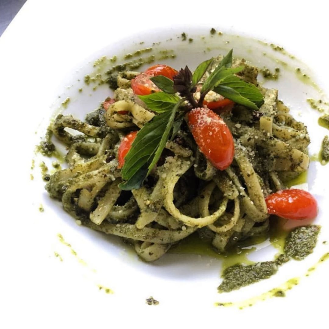 Salsa pesto de albahaca, jitomates cherries y queso parmesano.