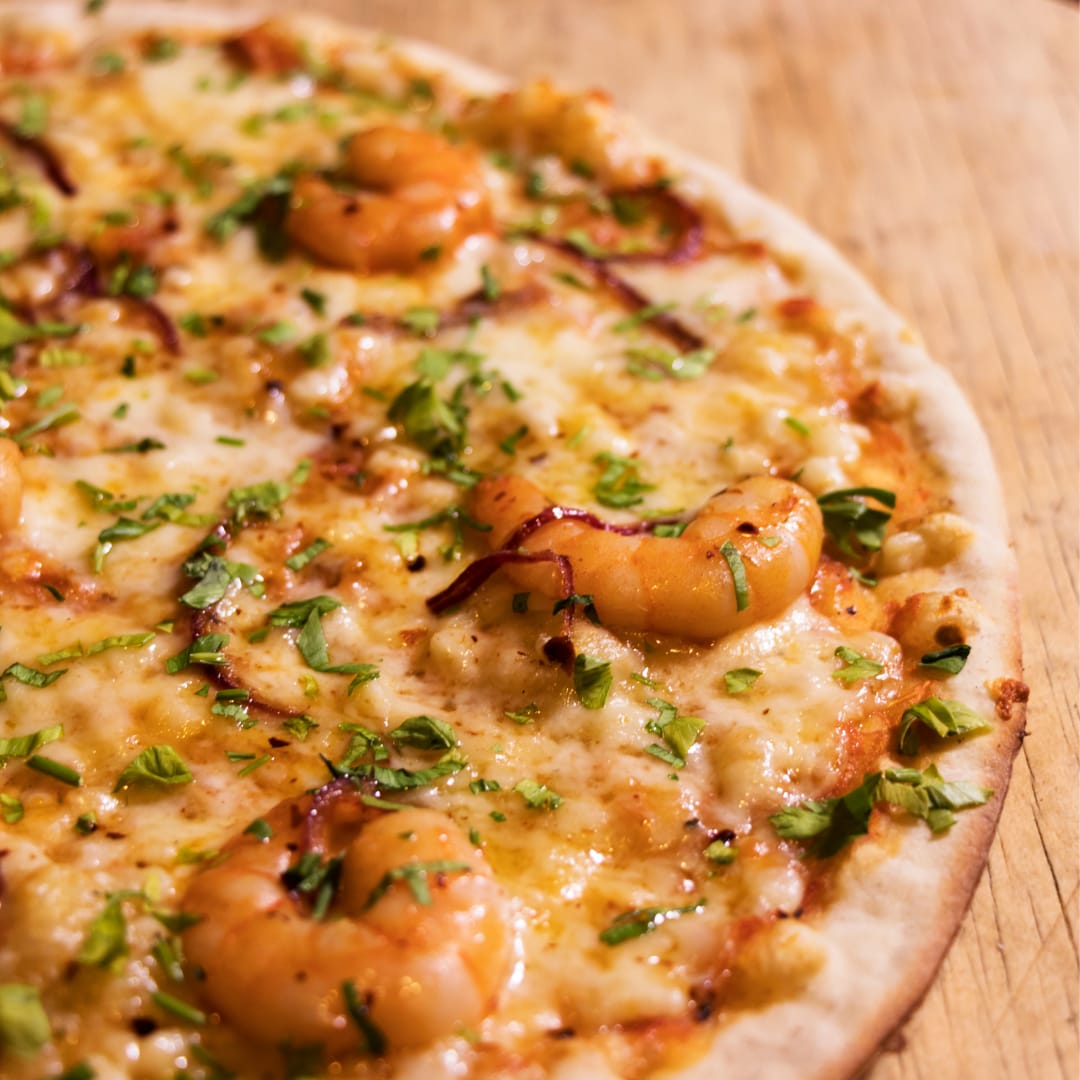 Salsa de tomate preparada en casa, cebolla, camarones salteados en vino blanco, cucharadita de crema, perejil fresco y pepperoni.
