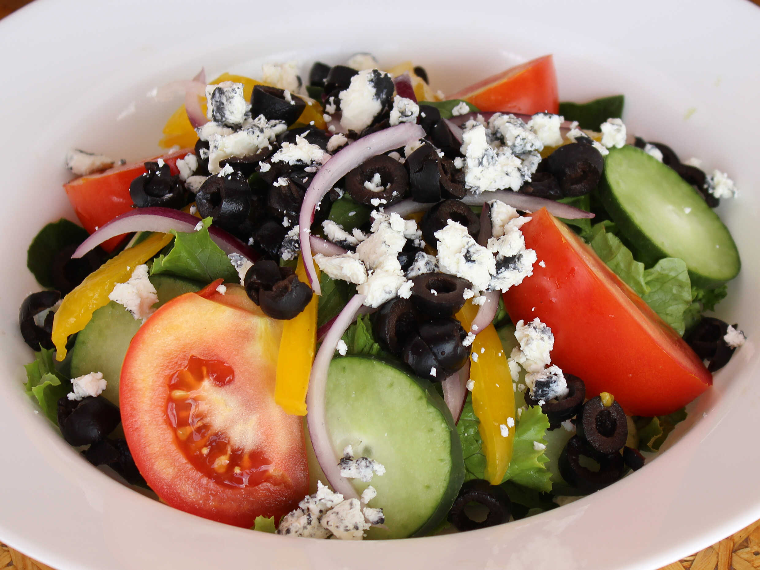Espinaca y lechuga, pepino, jitomate, aceitunas negras, pimientos, cebolla morada y vinagreta de orégano.
