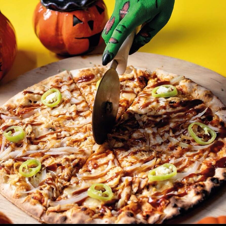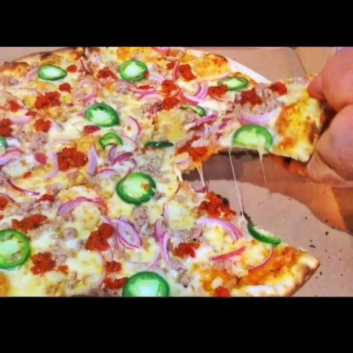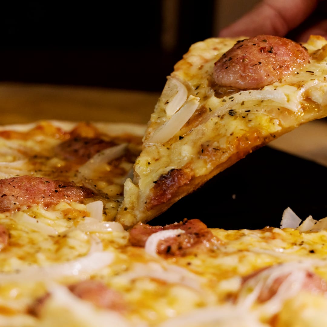 Masa Tradicional de pizza, salsa para pizza, queso mozzarella para fundir, cebolla morada, jalapeño, chorizo ranchero y mas queso encima.