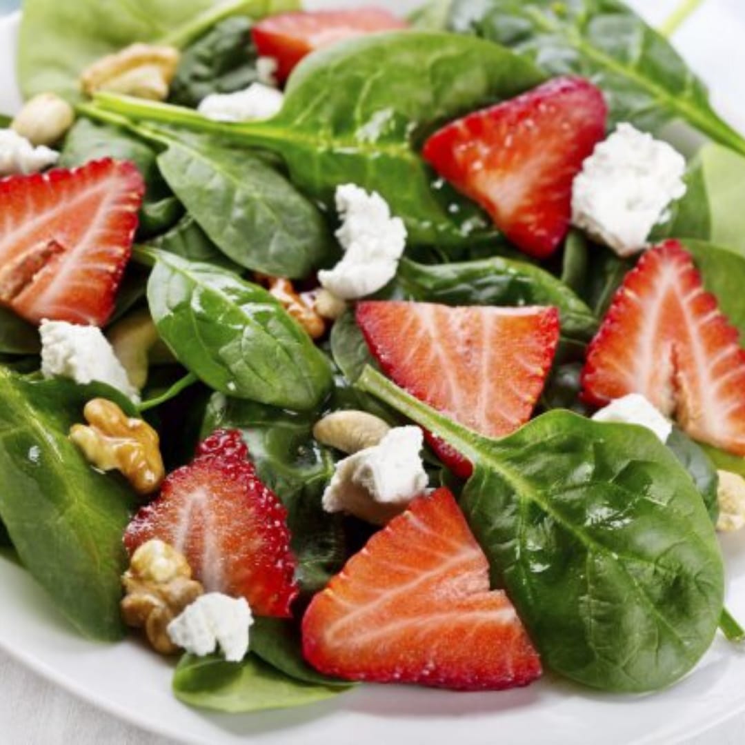 Espinacas baby, fresa, queso de cabra, nuez caramelizada, aderezo de miel y mostaza.