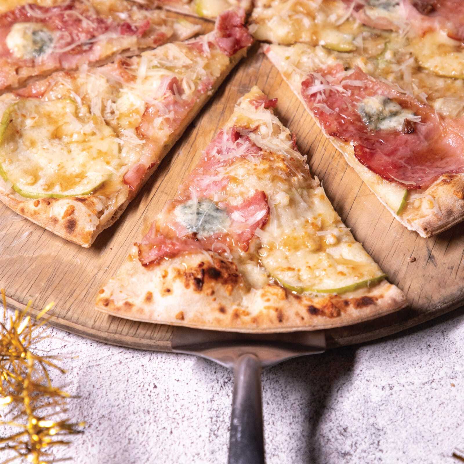 Una Pizza Muy Americana. El Sabor y Aroma Delicado que Posee, es Capaz de Satisfacer a Cualquiera. (manzana verde, ajo asado, queso azul, tocino, parmesano y miel de maple)