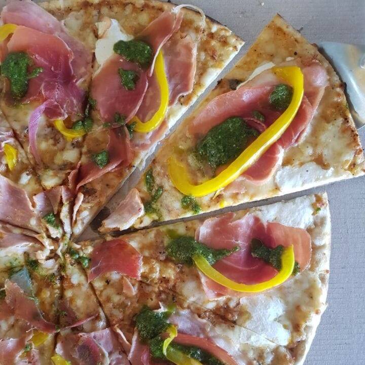 4 Quesos, pimientos, tocino, jamón serrano y pesto de albahaca.