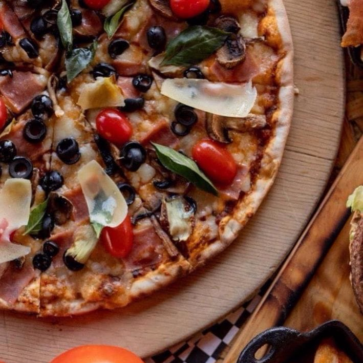 Jamón de pierna, alcachofa, aceituna negra, champiñones, albahaca y láminas de parmesano.
