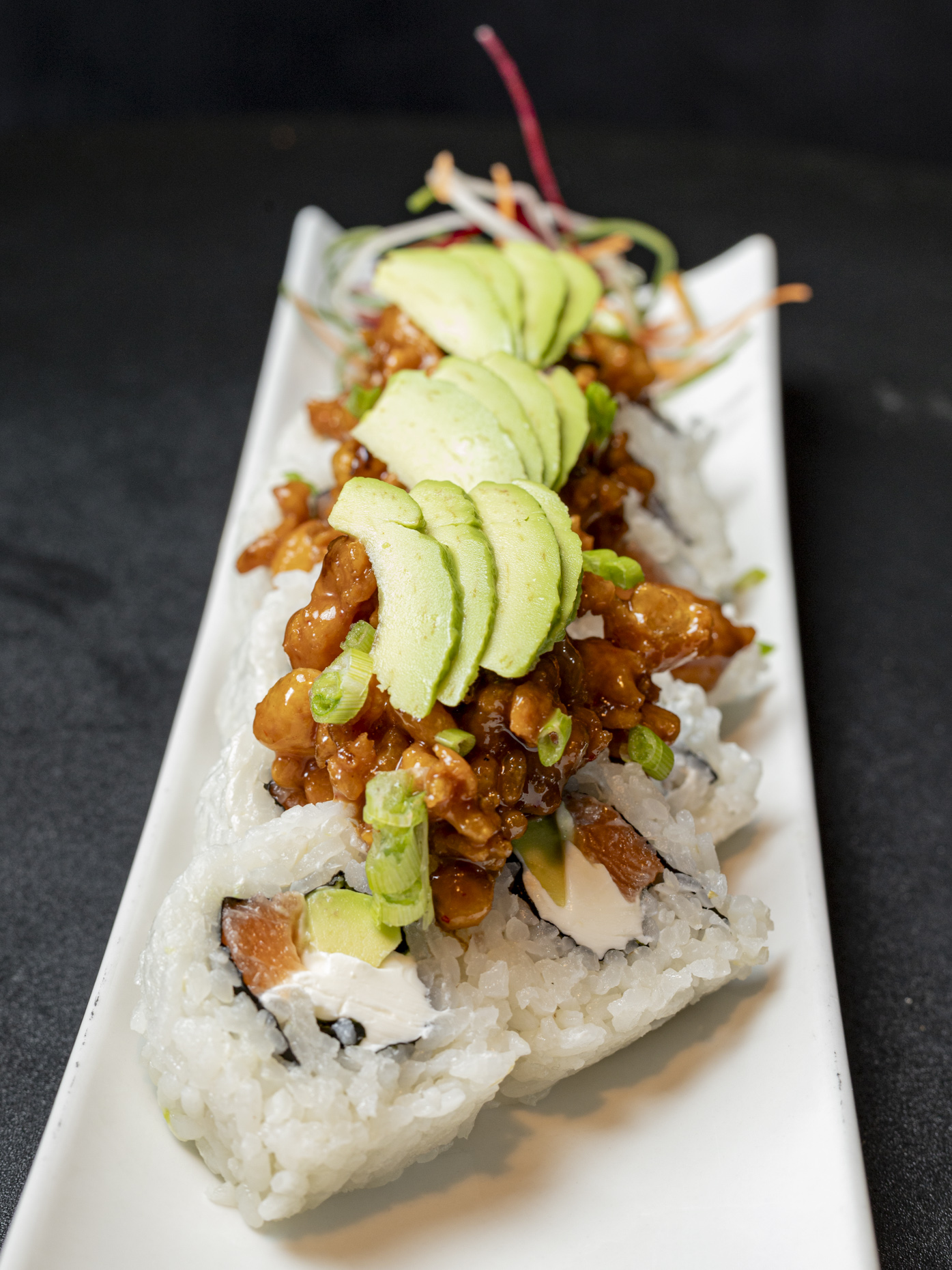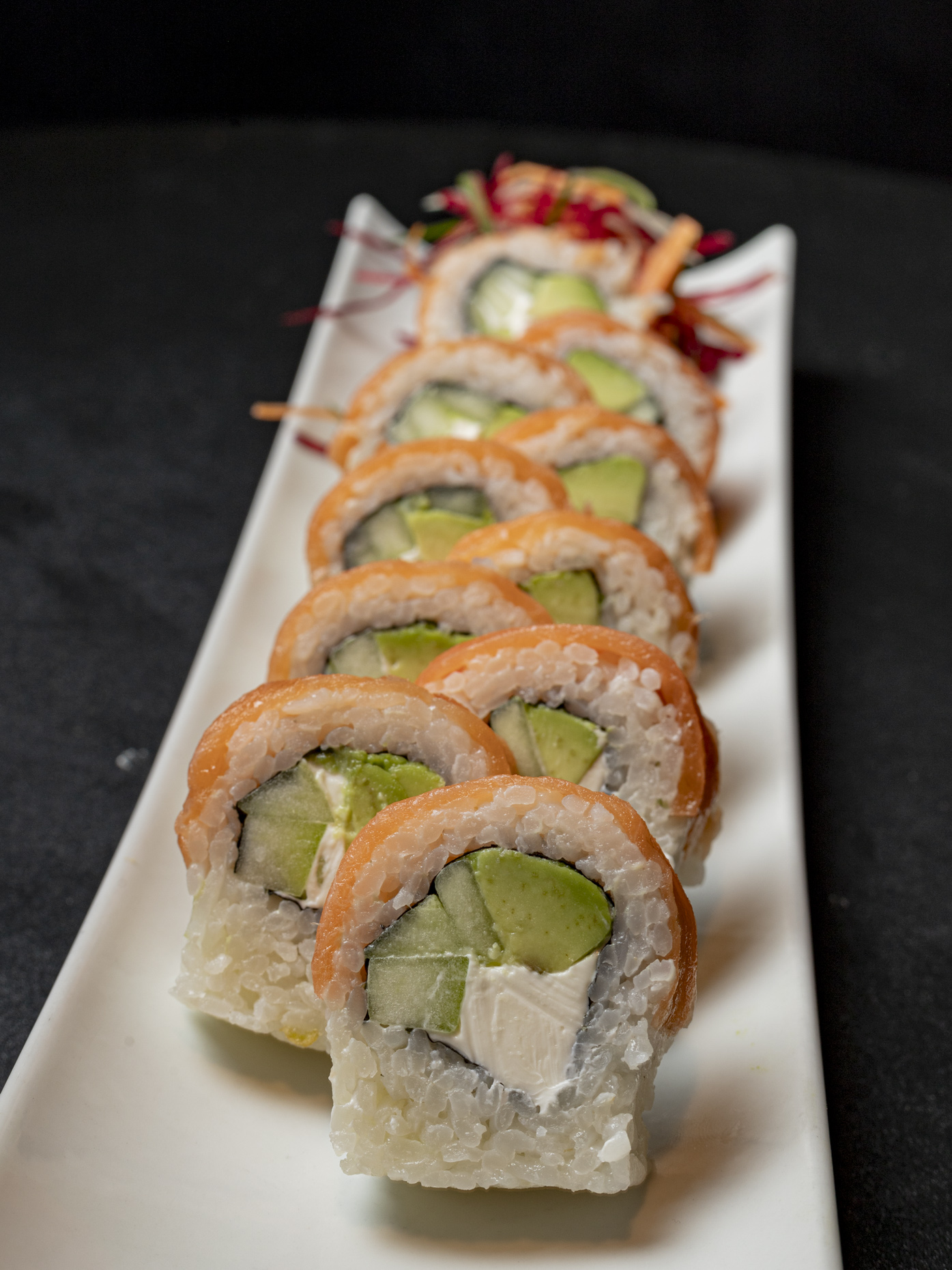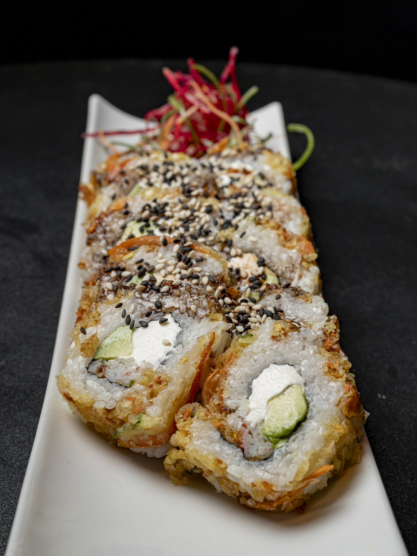 Alga, aguacate, queso Philadelphia, salmón fresco, cebollín, chispas tempura por fuera y aderezo spicy.