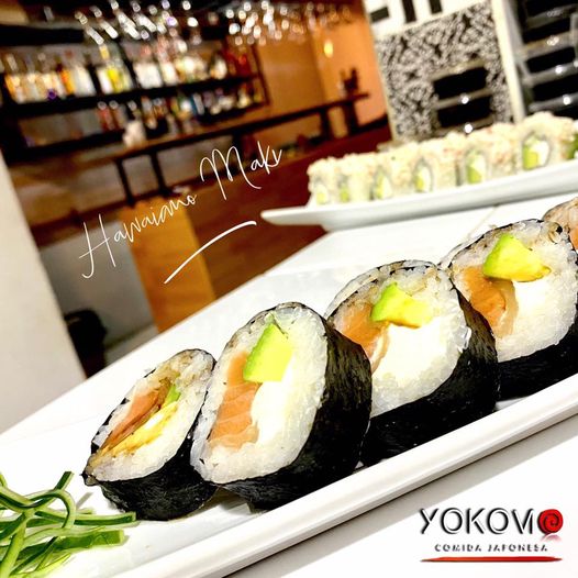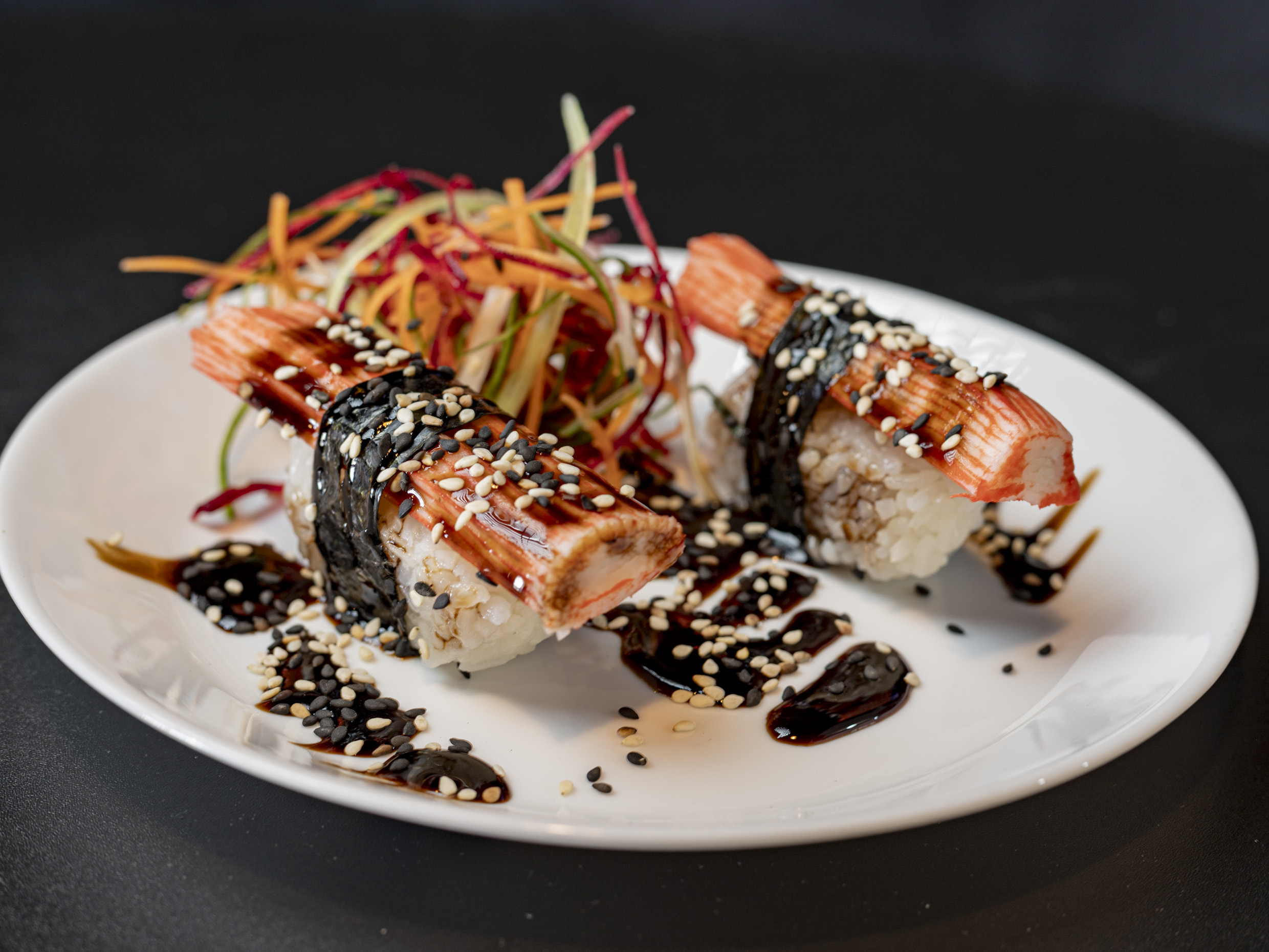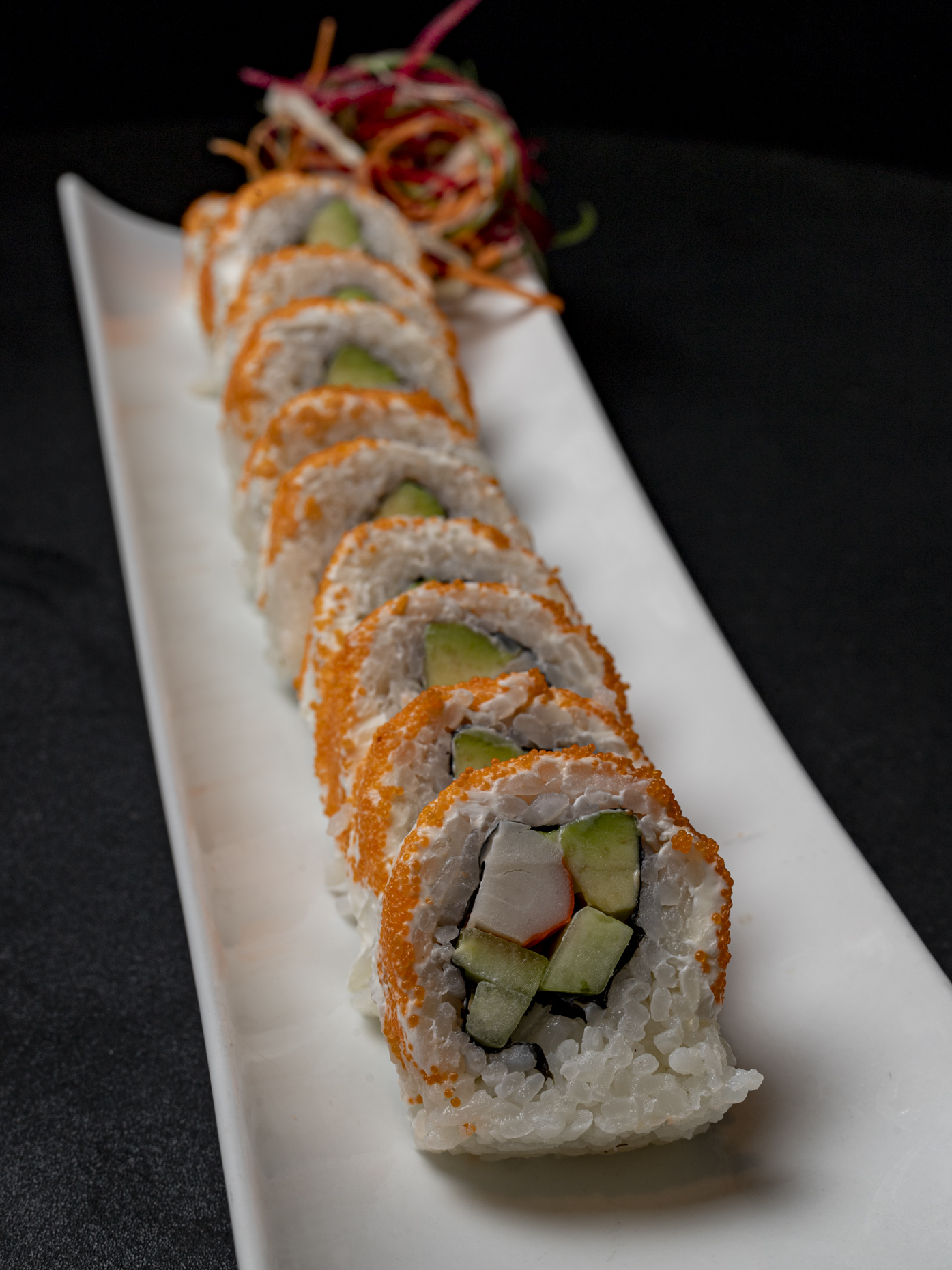 Alga, aguacate, queso Philadelphia, masago , pepino por fuera camarón, masago, salmón fresco, kanikama, bañado en salsa de anguila.