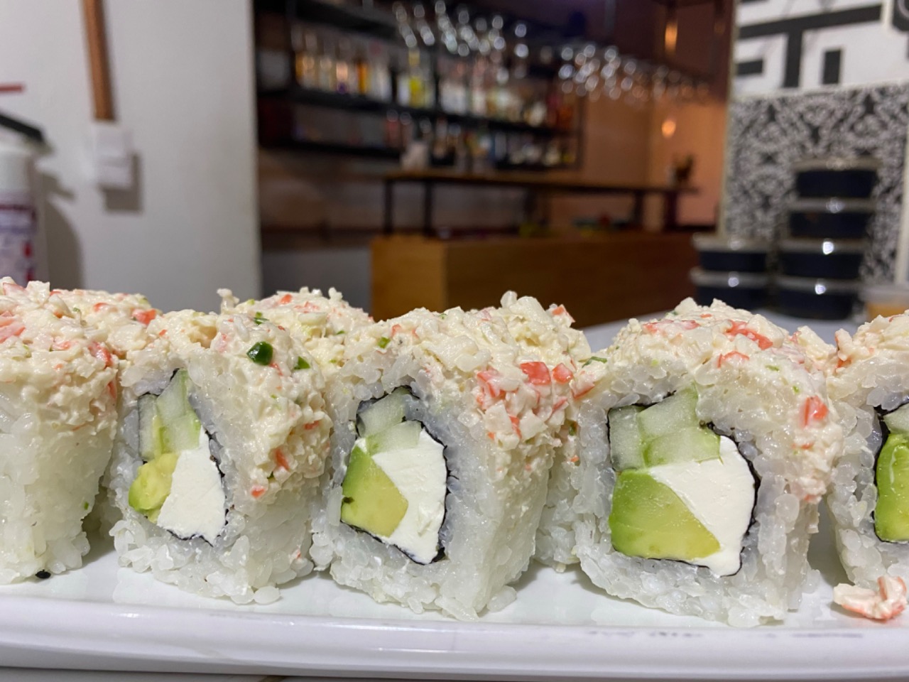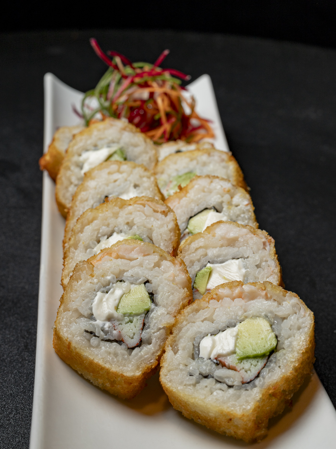 Alga, aguacate, queso Philadelphia, cangrejo, camarón picado por fuera y empanzado.