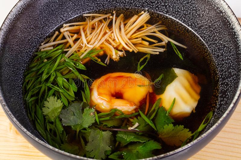 Sopa de pasta miso acompañado de calamar,surimi, camarón, pescado y cebolíin.